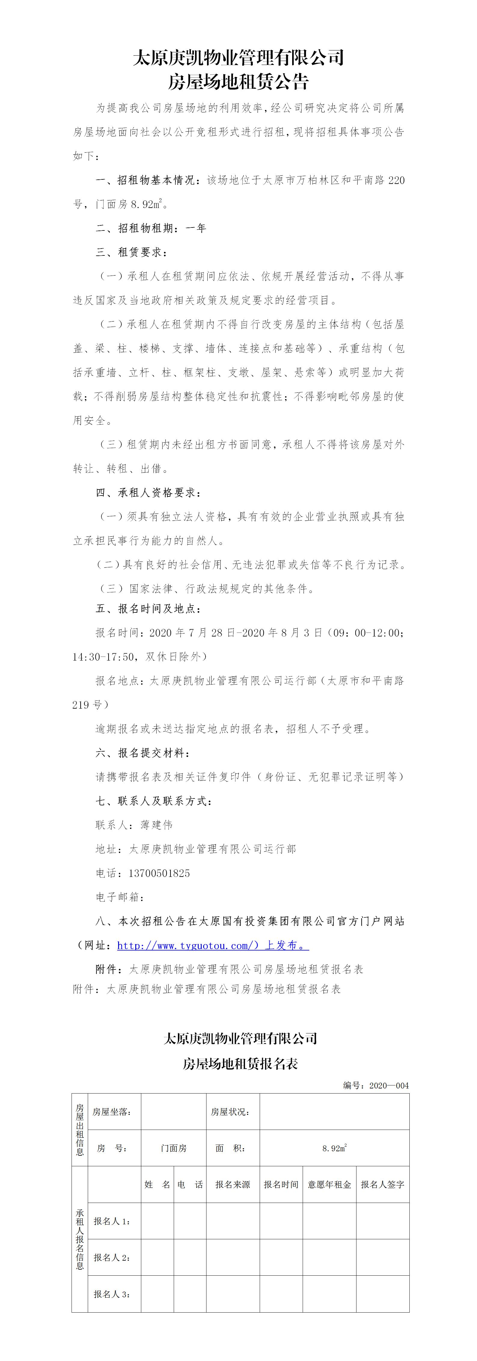 太原庚凱物業(yè)管理有限公司房屋場地租賃公告(四)