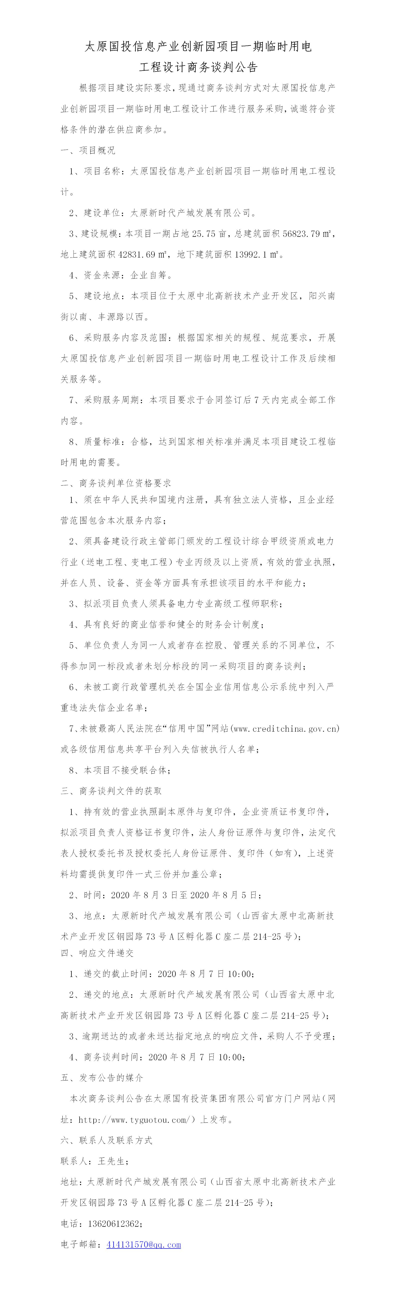 太原國投信息產(chǎn)業(yè)創(chuàng)新園項目一期臨時用電工程設計商務談判公告
