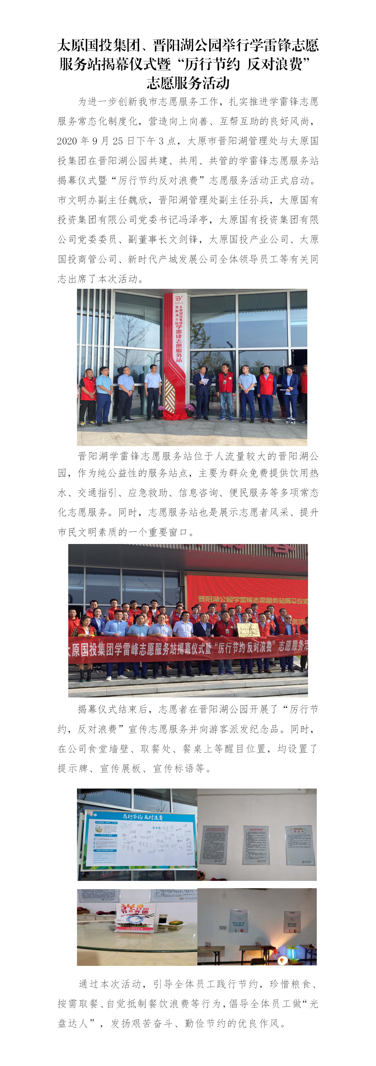 太原國投集團(tuán)、晉陽湖公園舉行學(xué)雷鋒志愿服務(wù)站揭幕儀式暨“厲行節(jié)約 反對浪費”志愿服務(wù)活動