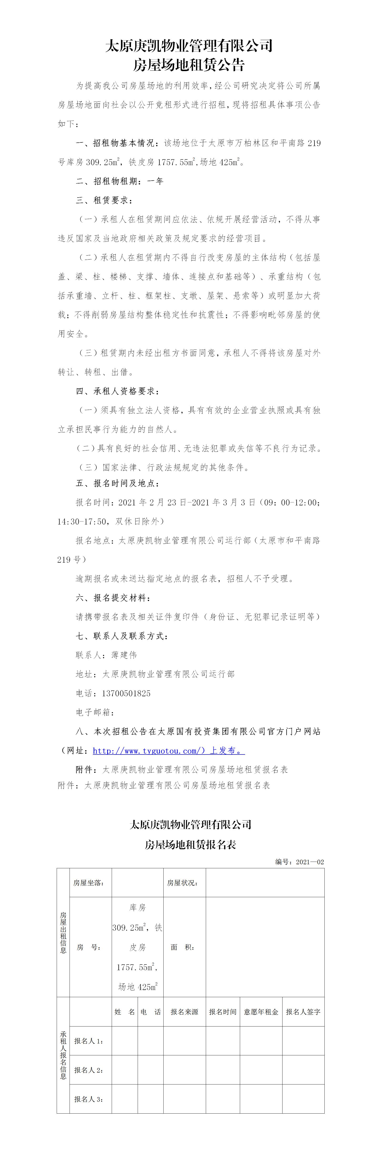 太原庚凱物業(yè)管理有限公司房屋場(chǎng)地租賃公告(二十三)