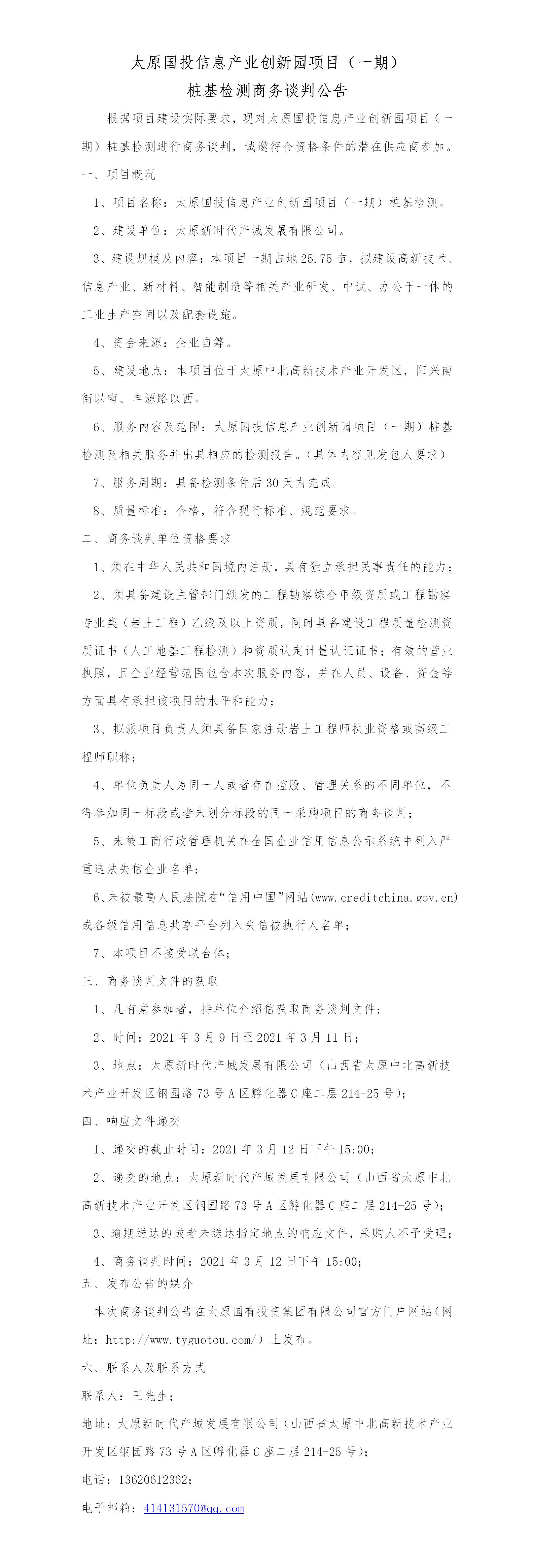 太原國(guó)投信息產(chǎn)業(yè)創(chuàng)新園項(xiàng)目(一期)樁基檢測(cè)商務(wù)談判公告