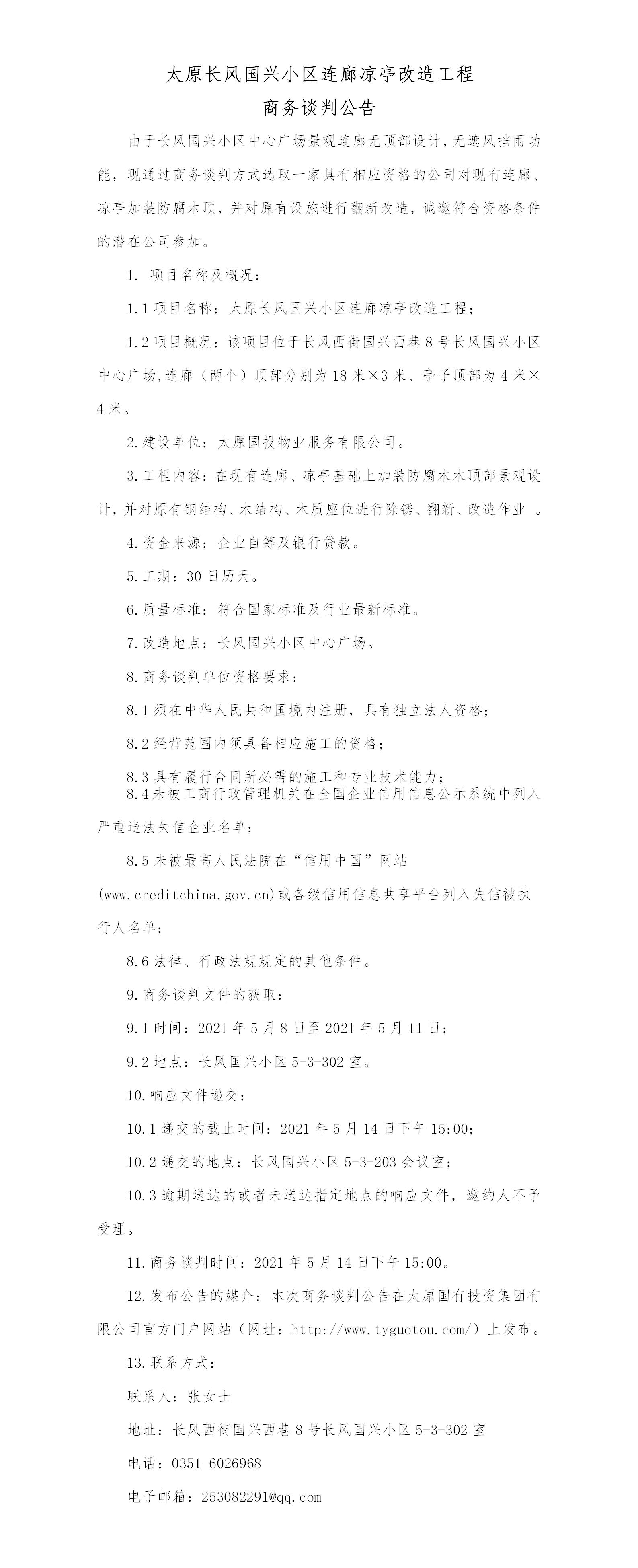 太原長(zhǎng)風(fēng)國(guó)興小區(qū)連廊涼亭改造工程商務(wù)談判公告