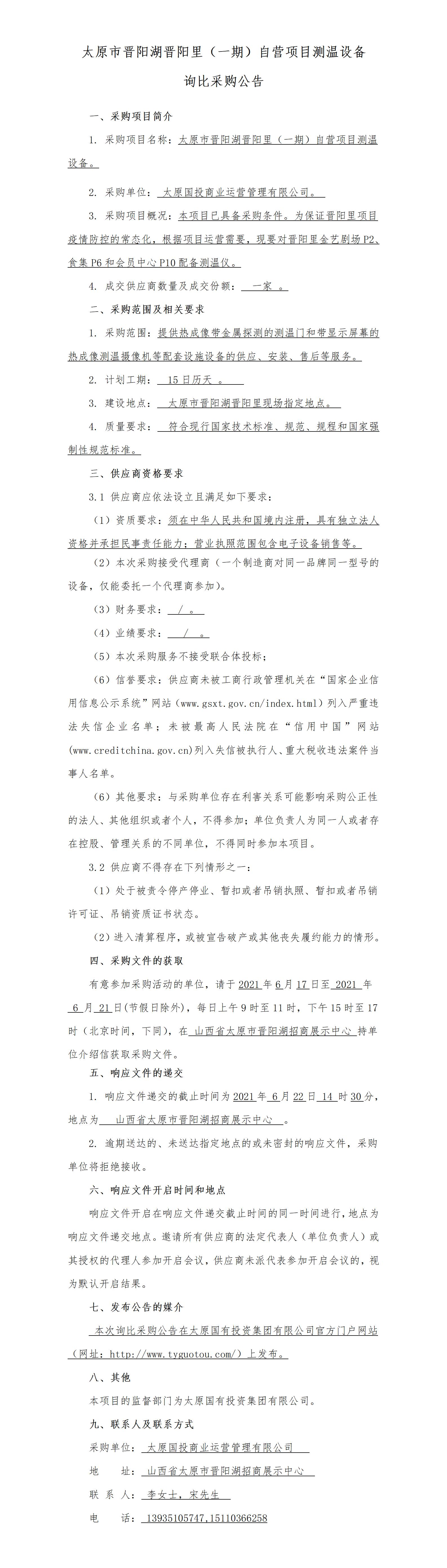 太原市晉陽湖晉陽里(一期)自營項目測溫設備詢比采購公告