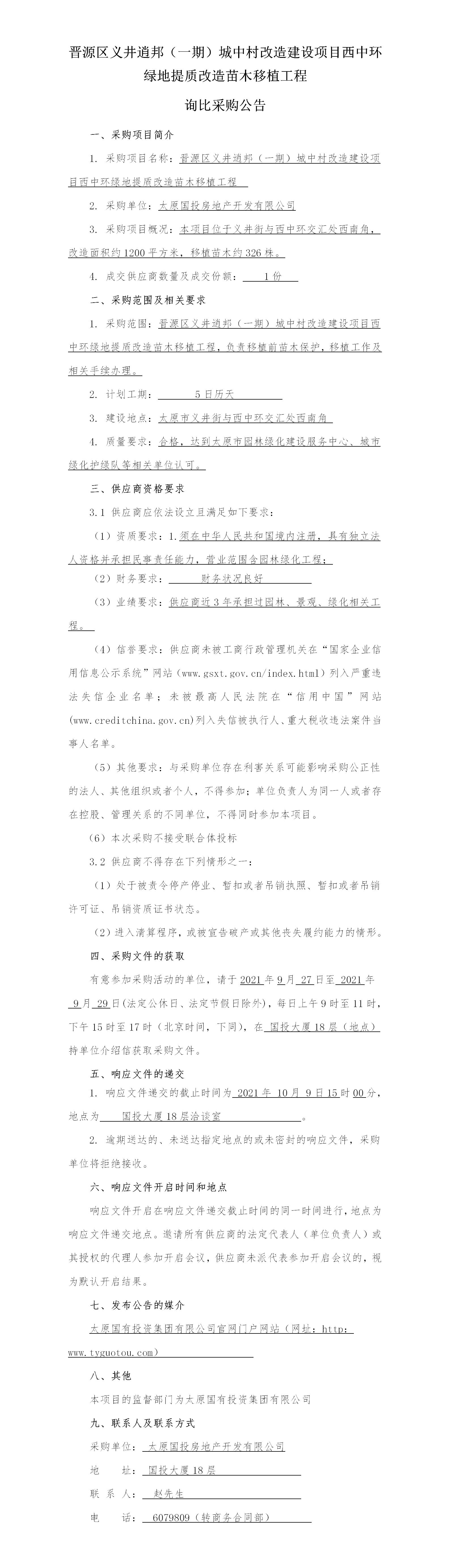 晉源區(qū)義井逍邦(一期)城中村改造建設(shè)項(xiàng)目西中環(huán)綠地提質(zhì)改造苗木移植工程詢比采購公告