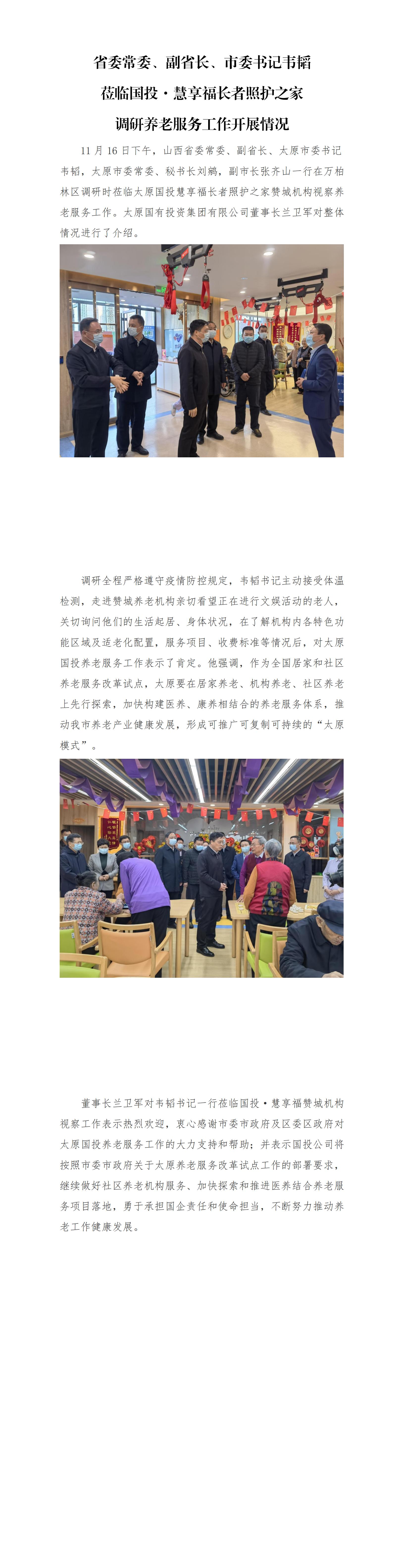 省委常委、副省長、市委書記韋韜蒞臨國投·慧享福長者照護之家調(diào)研養(yǎng)老服務(wù)工作開展情況
