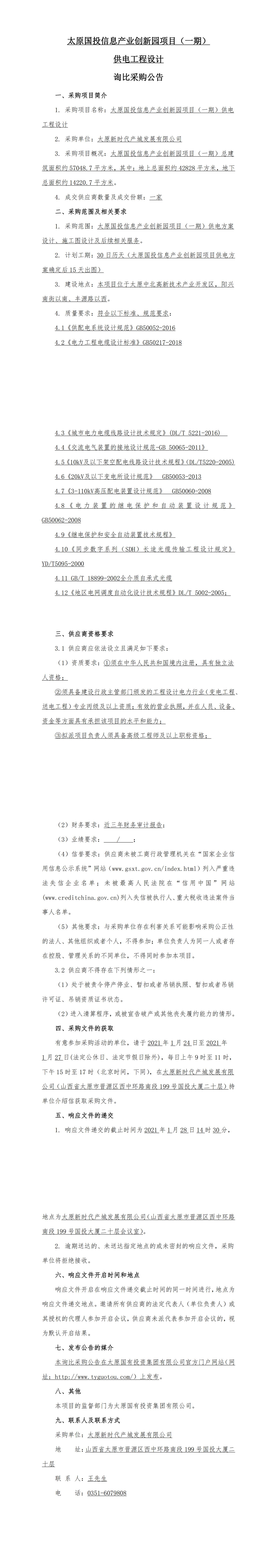 太原國投信息產(chǎn)業(yè)創(chuàng)新園項目(一期)供電工程設計詢比采購公告