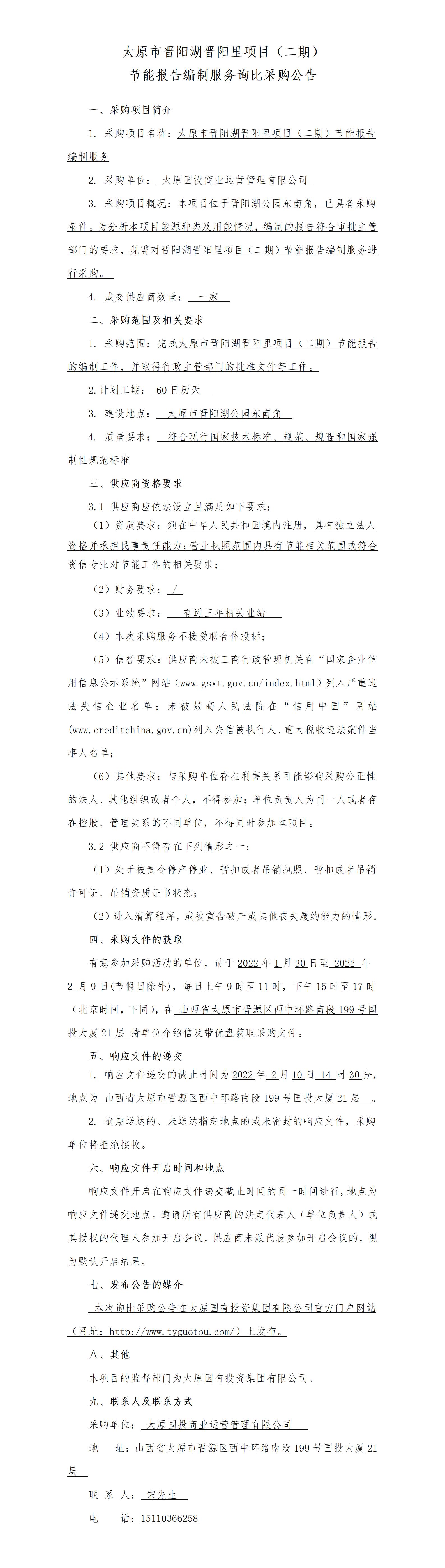 太原市晉陽(yáng)湖晉陽(yáng)里項(xiàng)目(二期)節(jié)能報(bào)告編制服務(wù)詢比采購(gòu)公告