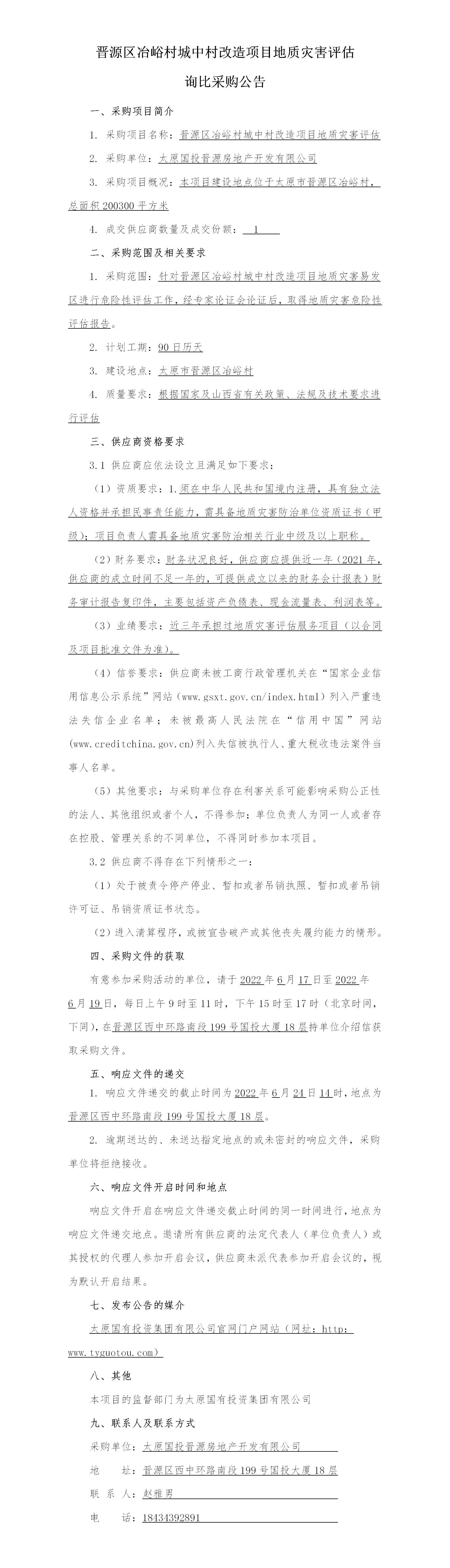晉源區(qū)冶峪村城中村改造項(xiàng)目地質(zhì)災(zāi)害評(píng)估詢(xún)比采購(gòu)公告