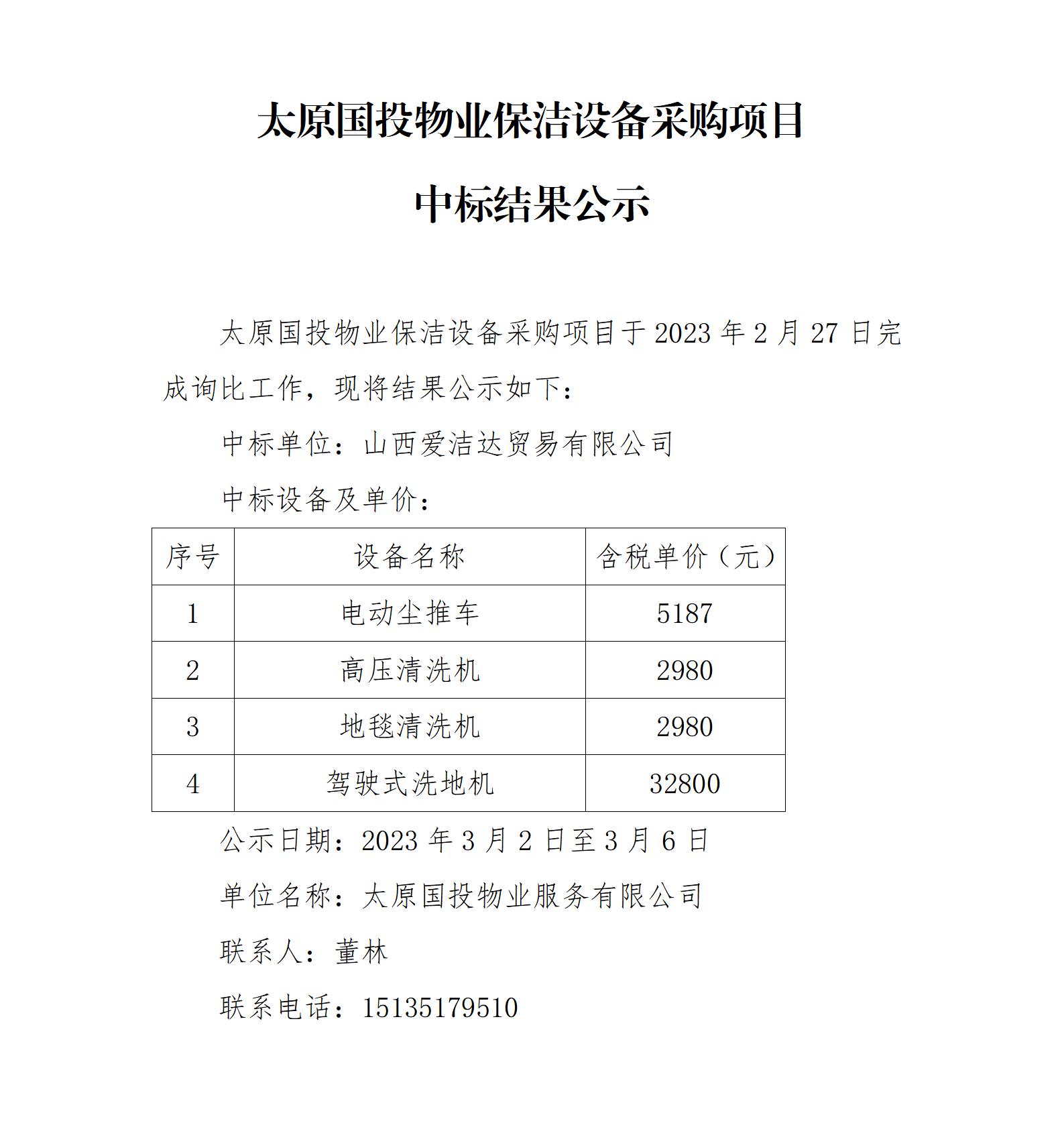 太原國投物業(yè)保潔設(shè)備采購項目中標結(jié)果公示