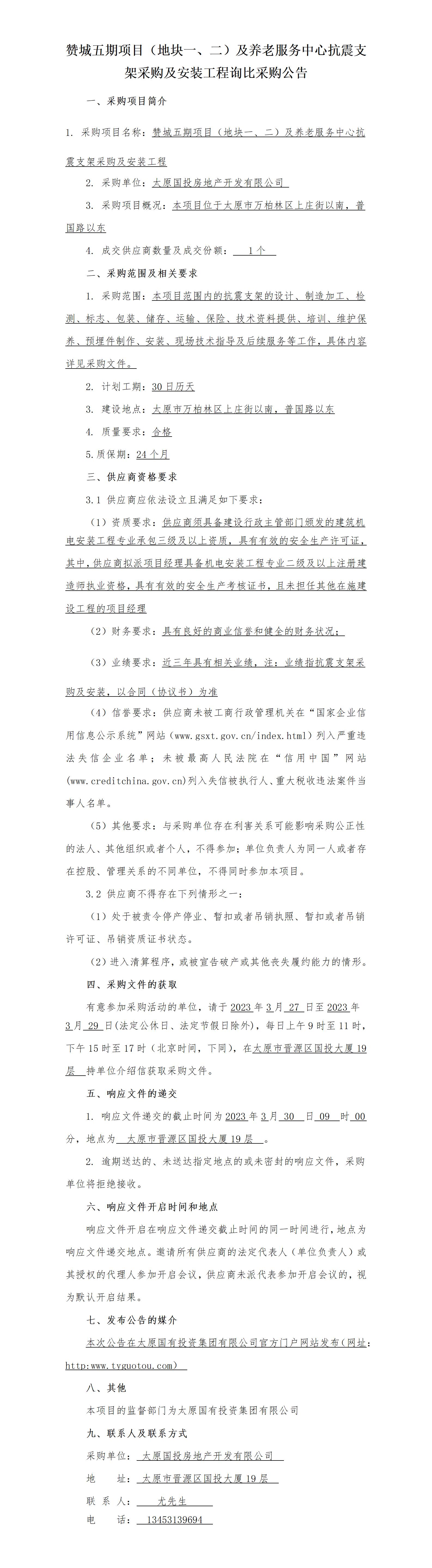 贊城五期項(xiàng)目(地塊一、二)及養(yǎng)老服務(wù)中心抗震支架采購及安裝工程詢比采購公告