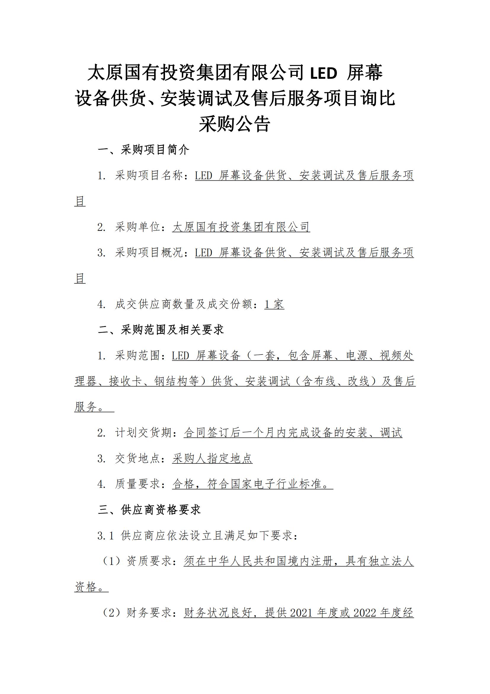 太原國有投資集團有限公司LED 屏幕 設備供貨、安裝調(diào)試及售后服務項目詢比采購公告