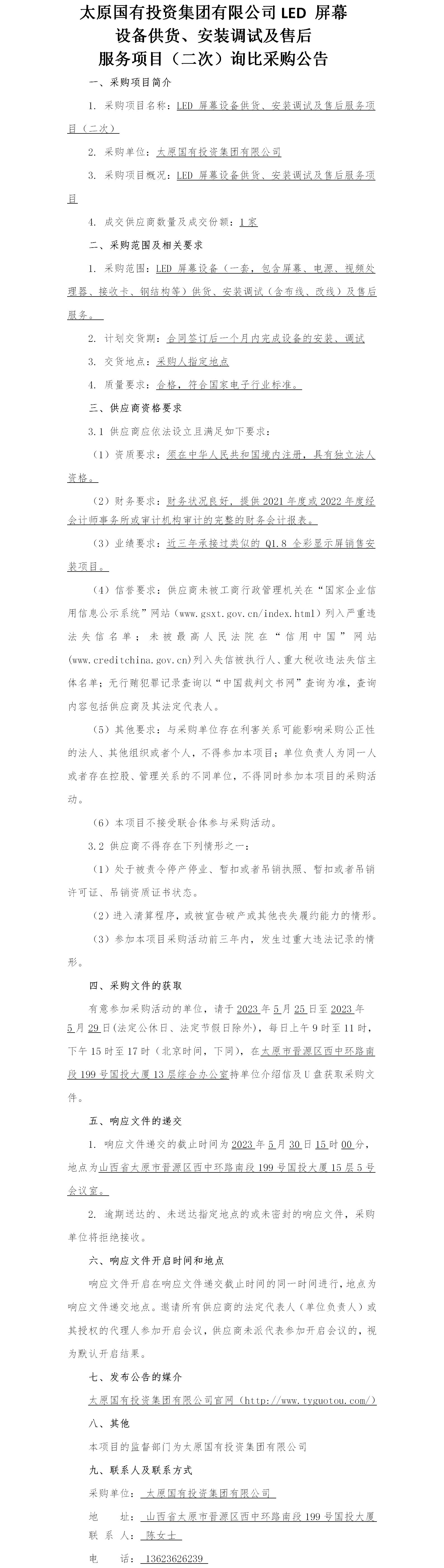 太原國有投資集團有限公司LED 屏幕設(shè)備供貨、安裝調(diào)試及售后服務(wù)項目(二次)詢比采購公示
