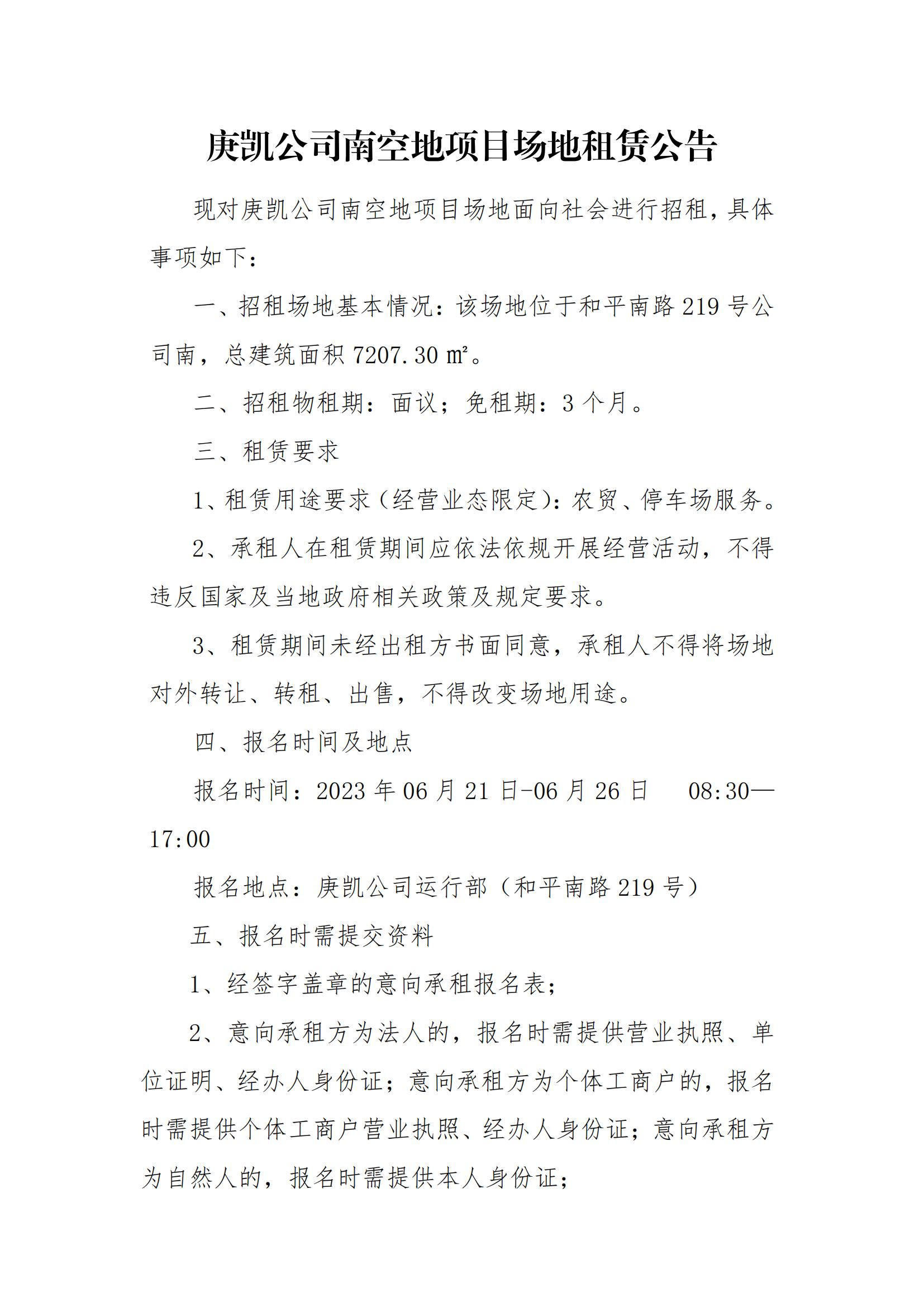 庚凱公司南空地項(xiàng)目場(chǎng)地租賃公告