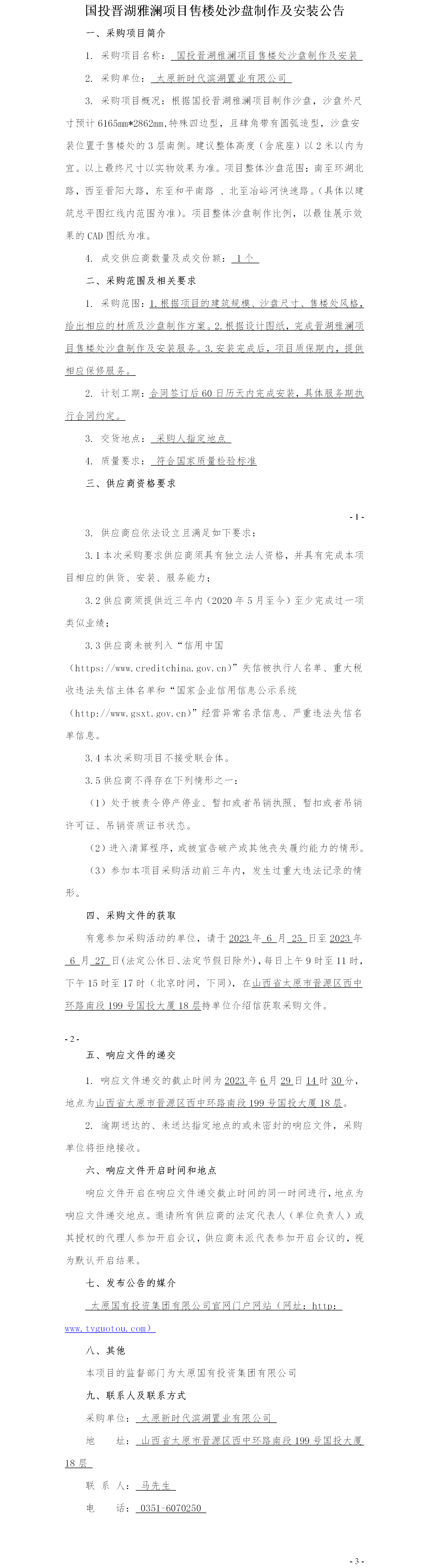 國投晉湖雅瀾項(xiàng)目售樓處沙盤制作及安裝詢比公告