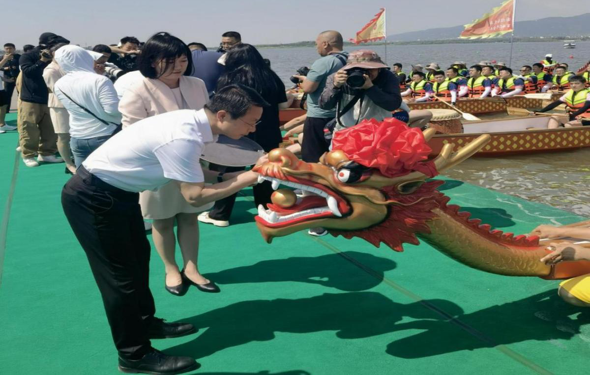 晉源區(qū)委書(shū)記張農(nóng)壽,晉源區(qū)長(zhǎng)張耀,省文旅廳處長(zhǎng)馮海明,國(guó)投集團(tuán)董事長(zhǎng)蘭衛(wèi)軍為本次活動(dòng)的龍舟“披紅點(diǎn)睛”,一點(diǎn)天庭,吉星高照,鴻運(yùn)當(dāng)頭;二點(diǎn)龍鼻,和諧幸福,萬(wàn)家平安;三點(diǎn)口利,笑口常開(kāi),大吉大利;四點(diǎn)龍角,風(fēng)調(diào)雨順,國(guó)泰民安;五點(diǎn)龍睛,愿龍舟為大家?guī)?lái)健康、吉祥和如意。