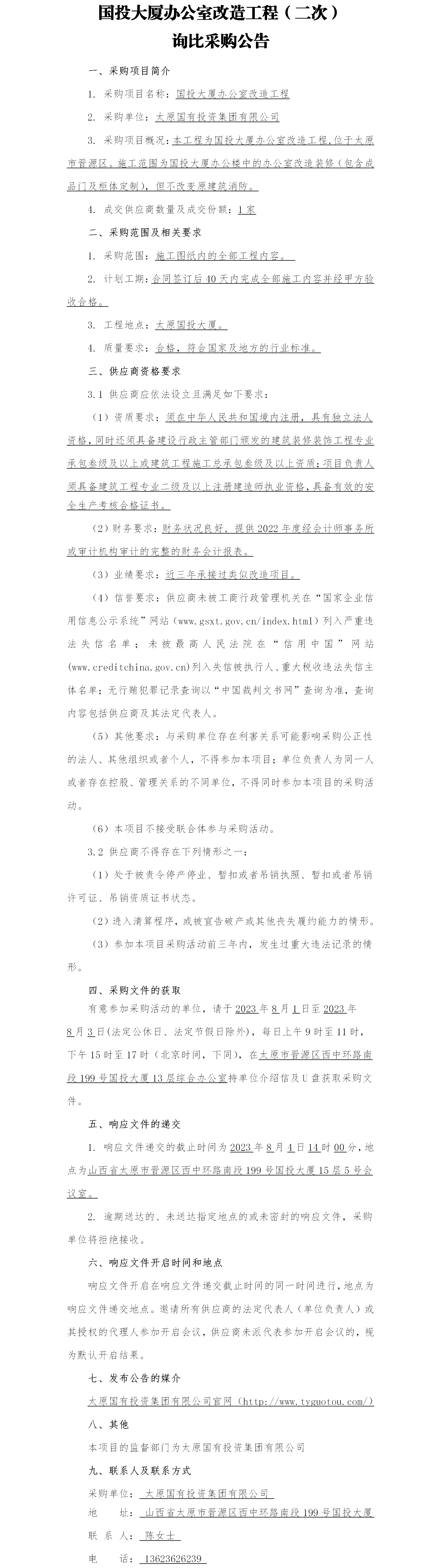 國投大廈辦公室改造工程(二次) 詢比采購公告