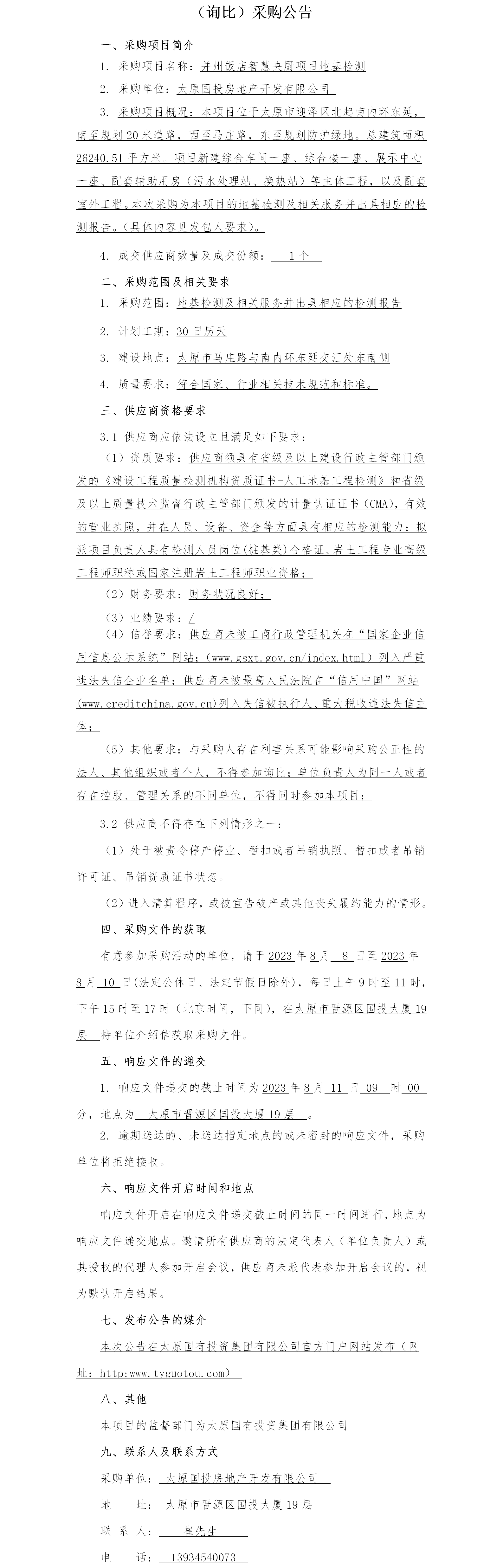并州飯店智慧央廚項目地基檢測(詢比)采購公告