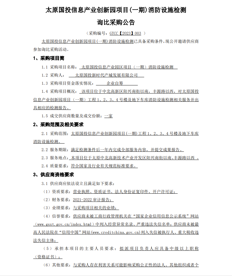 太原國投信息產(chǎn)業(yè)創(chuàng)新園項目(一期)消防設(shè)施檢測 詢比采購公告