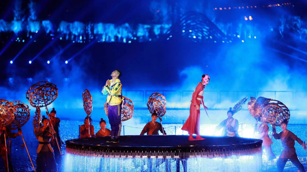 演出現(xiàn)場,流淌的水波光影從湖中心蔓延至觀眾腳下,如夢如幻。震撼視覺的火焰場景和撲面而來的熱浪,讓人如同身臨其境。湖光山色、燈光水影中,上百架無人機(jī)夜空作畫,似漫天流星伴著璀璨光芒劃過天際,給觀眾帶來了浪漫唯美的沉浸式體驗(yàn)。
