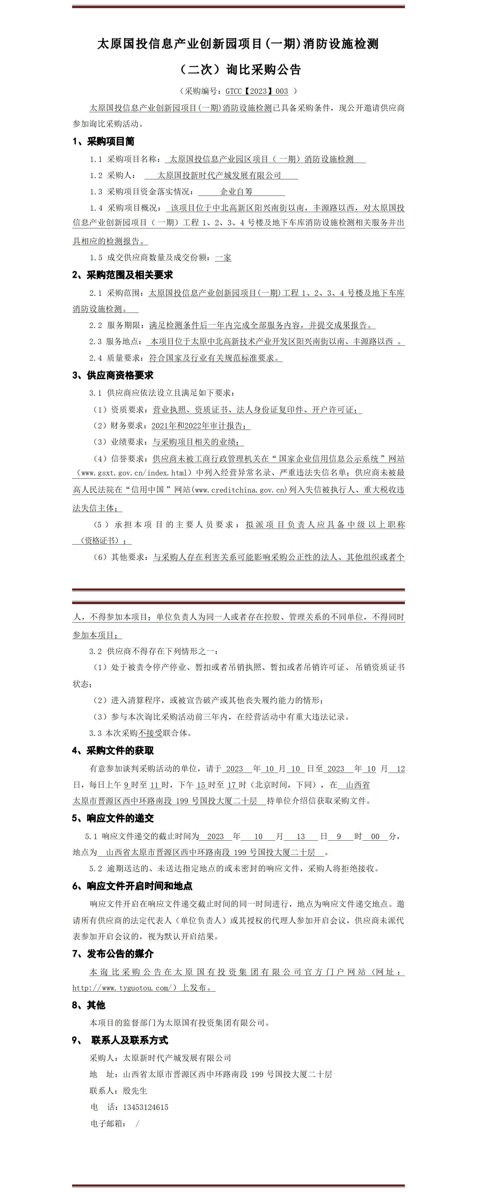 太原國(guó)投信息產(chǎn)業(yè)創(chuàng)新園項(xiàng)目(一期)消防設(shè)施檢測(cè) 詢比采購(gòu)公告