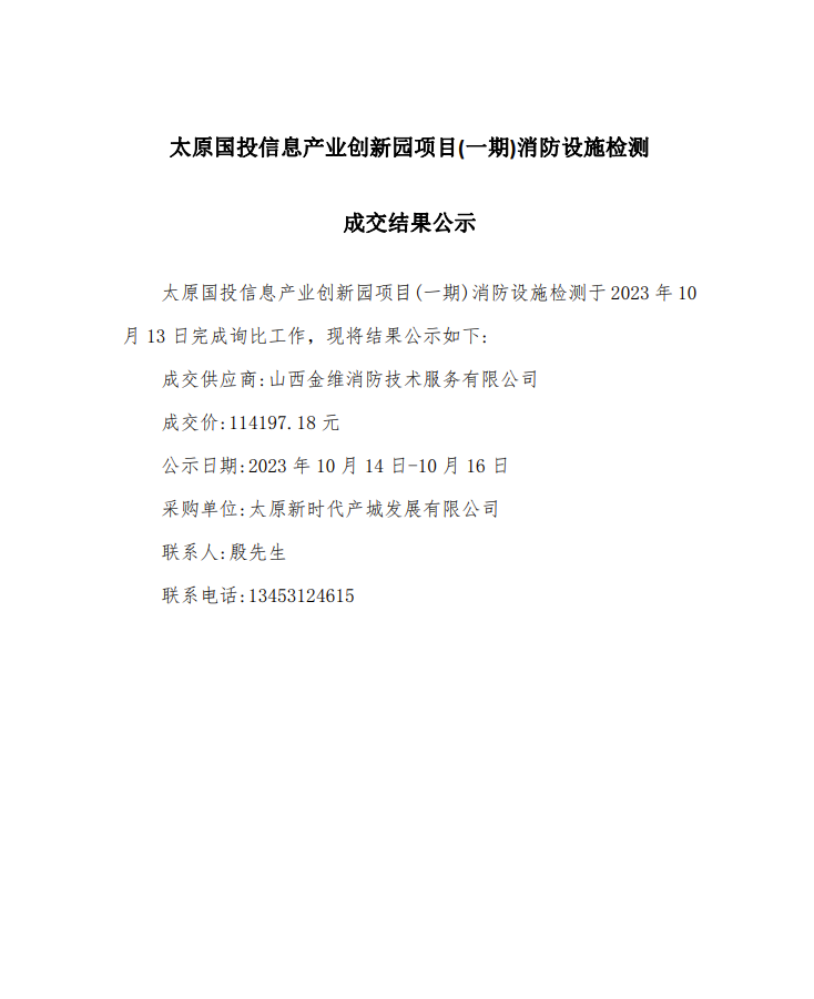 太原國(guó)投信息產(chǎn)業(yè)創(chuàng)新園項(xiàng)目(一期)消防設(shè)施檢測(cè)成交結(jié)果公告