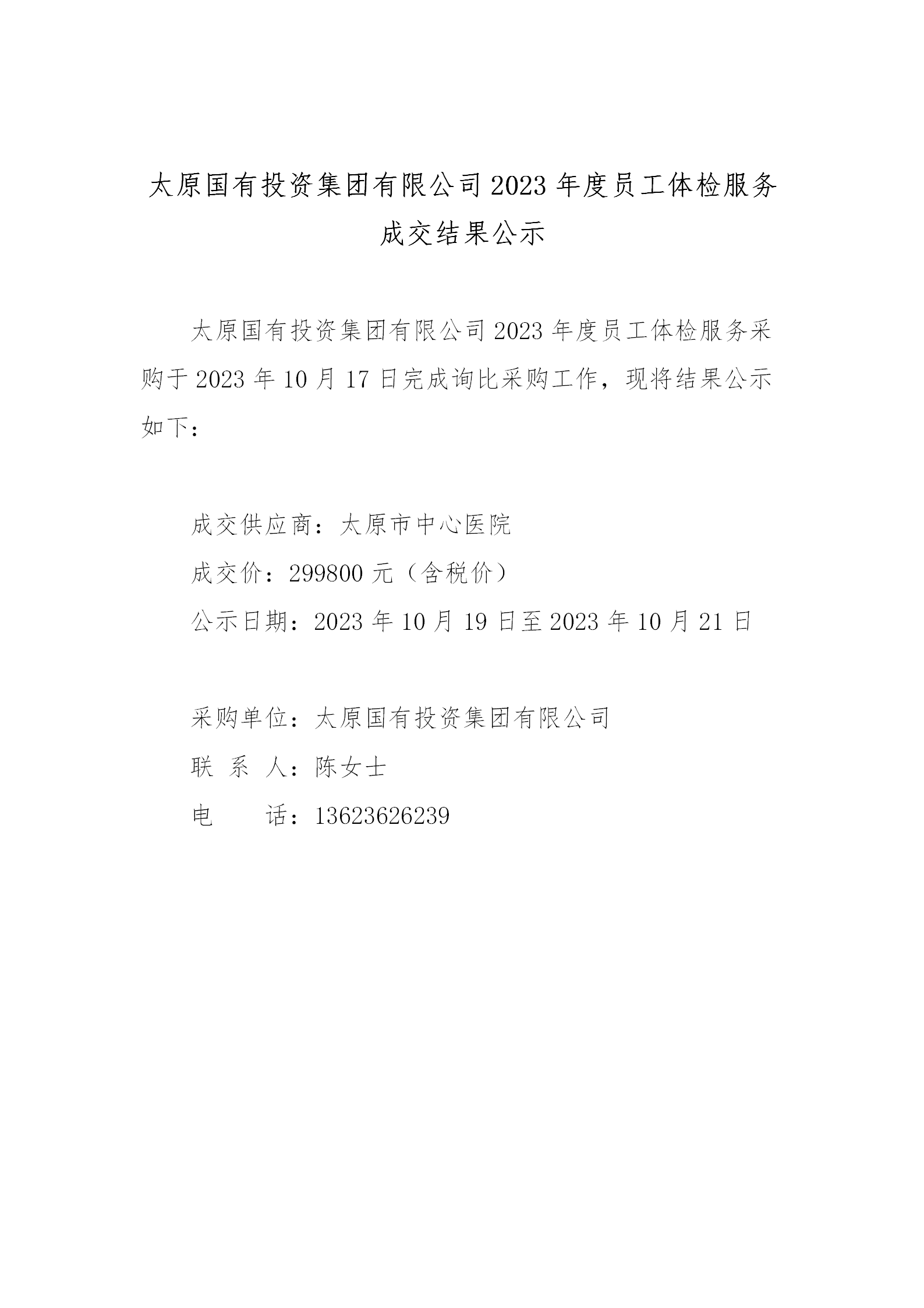 太原國有投資集團有限公司2023年度員工體檢服務(wù)項目詢比采購結(jié)果公示