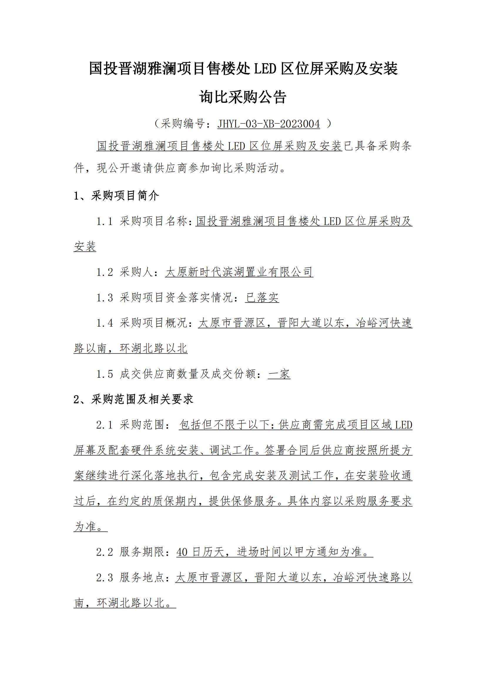 國投晉湖雅瀾項(xiàng)目售樓處LED區(qū)位屏采購及安裝詢比采購公告