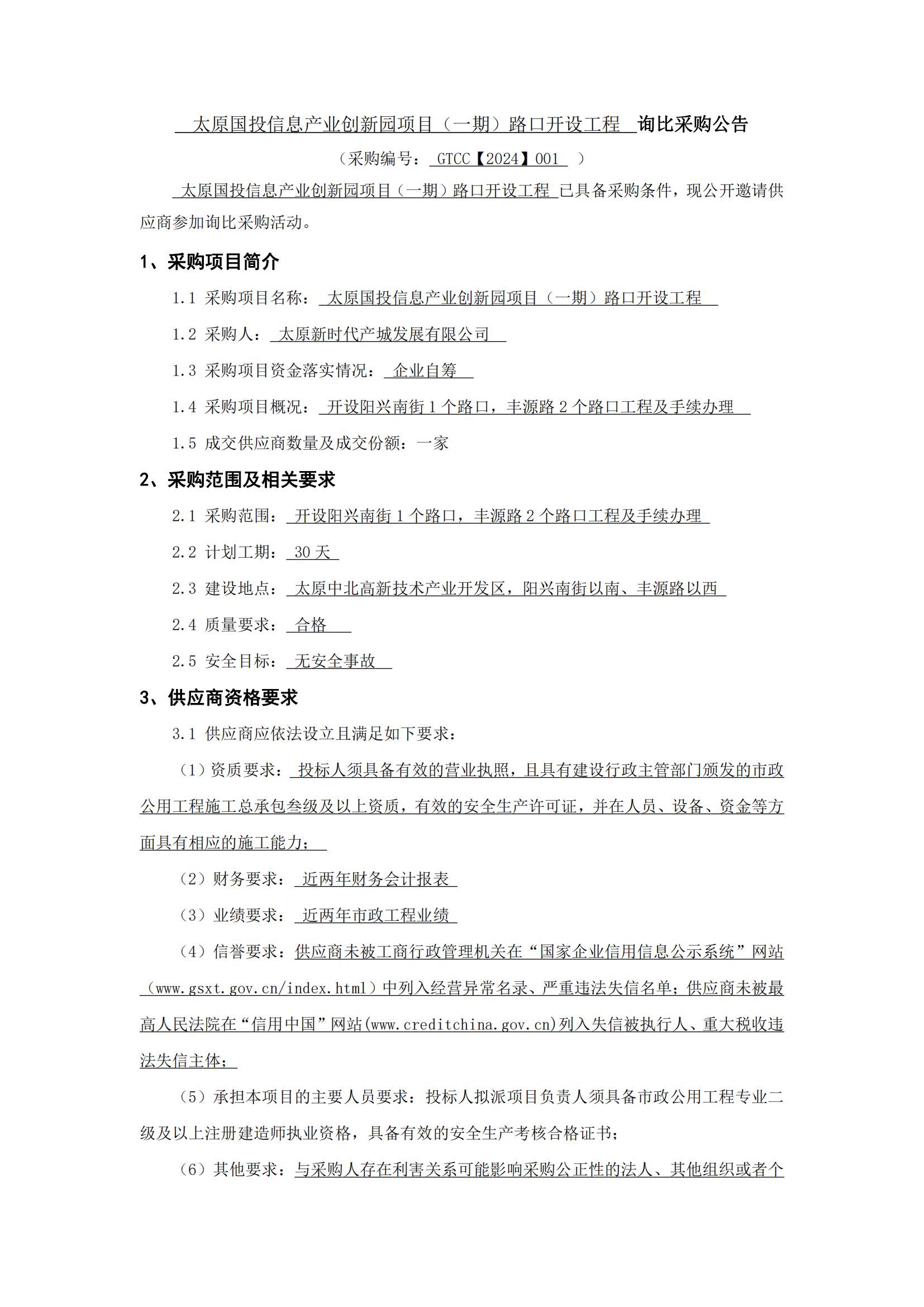 太原國投信息產(chǎn)業(yè)創(chuàng)新園項(xiàng)目(一期)路口開設(shè)工程 詢比采購公告