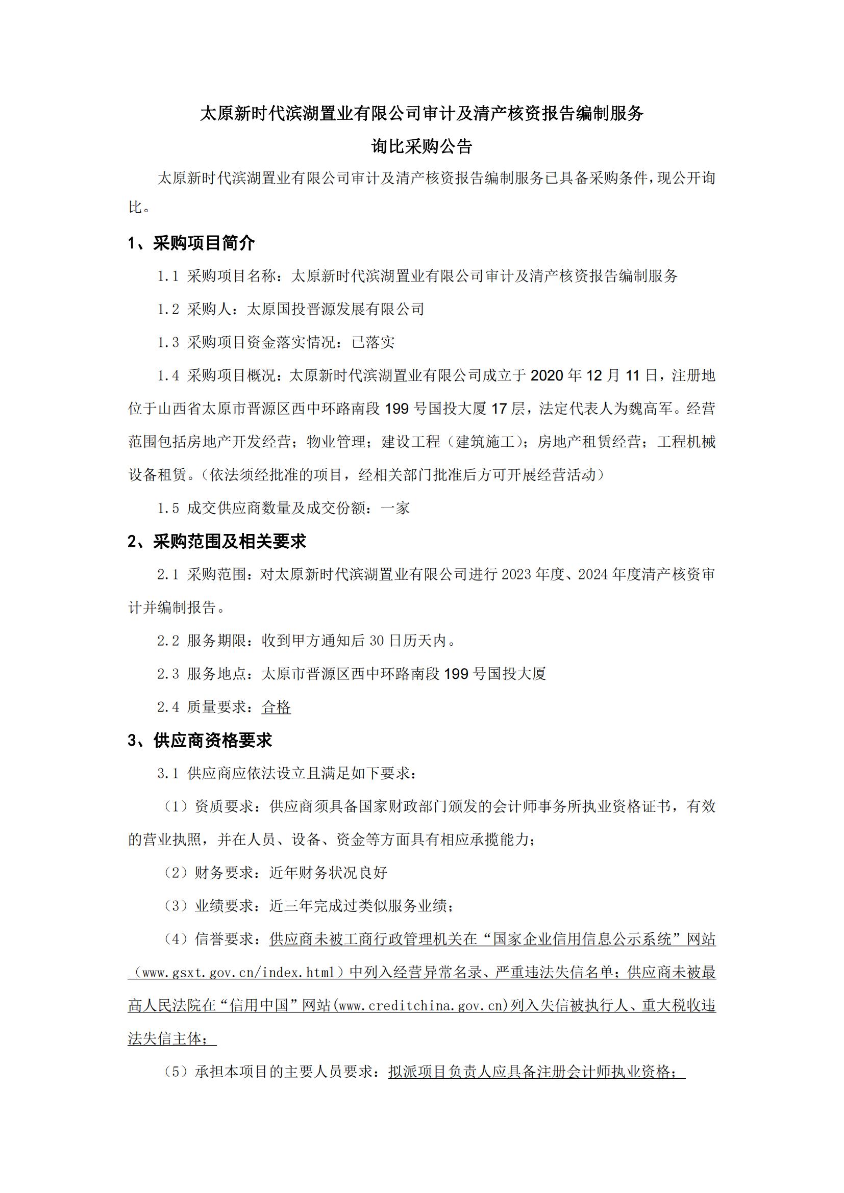 太原新時代濱湖置業(yè)有限公司審計及清產(chǎn)核資報告編制服務(wù)詢比采購公告