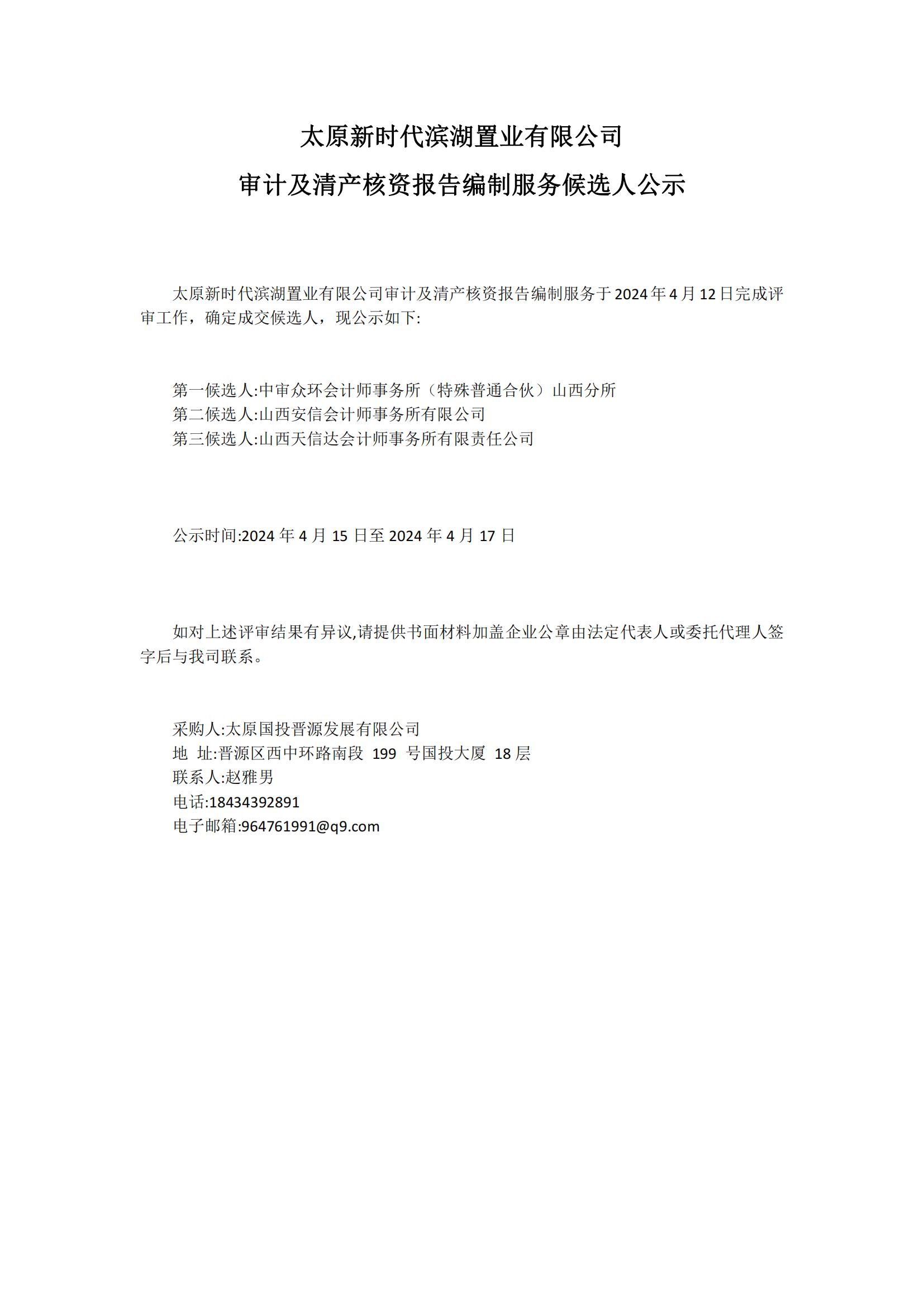 太原新時(shí)代濱湖置業(yè)有限公司 審計(jì)及清產(chǎn)核資報(bào)告編制服務(wù)候選人公示