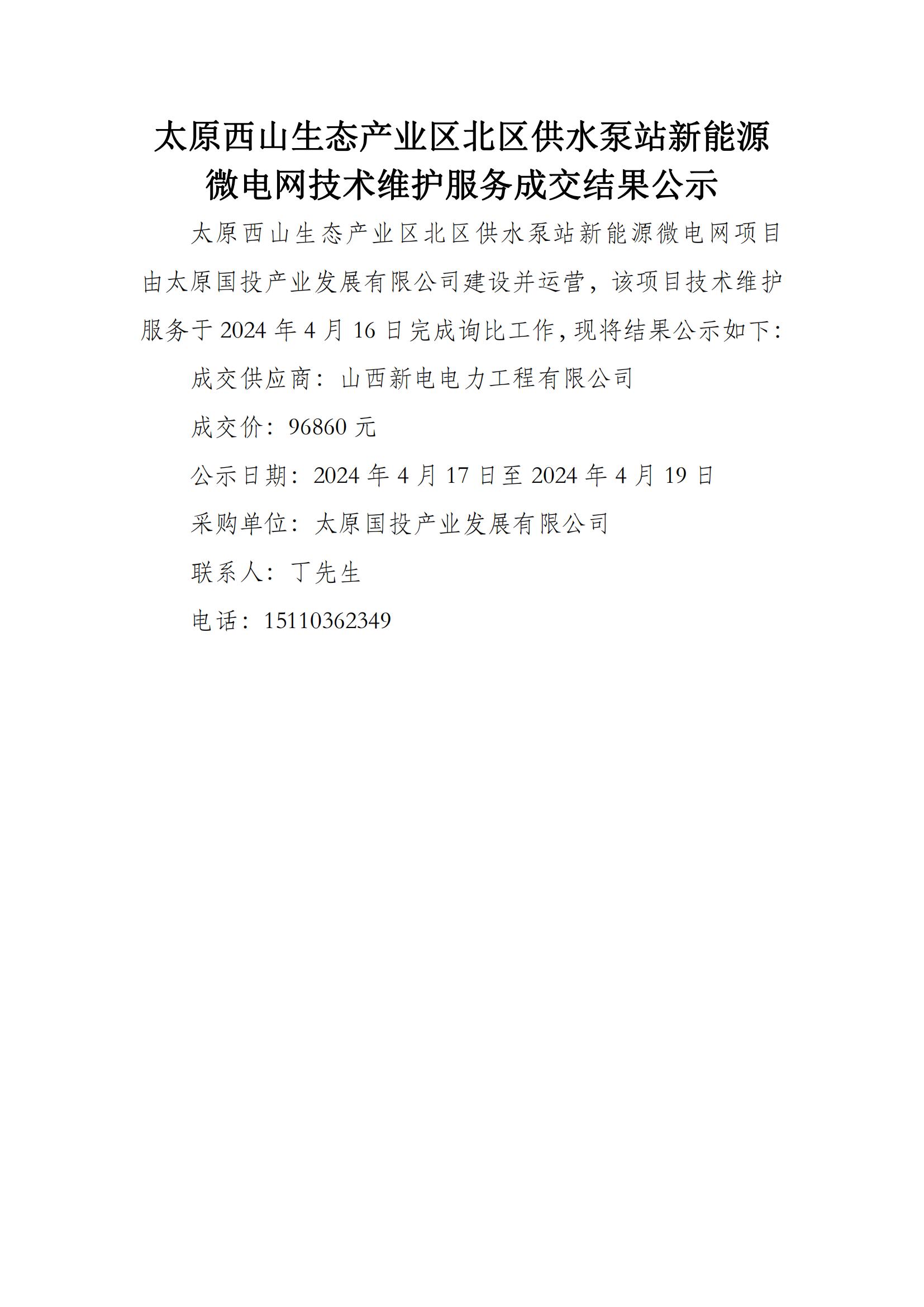 太原西山生態(tài)產(chǎn)業(yè)區(qū)北區(qū)供水泵站新能源微電網(wǎng)技術(shù)維護(hù)服務(wù)成交結(jié)果公示