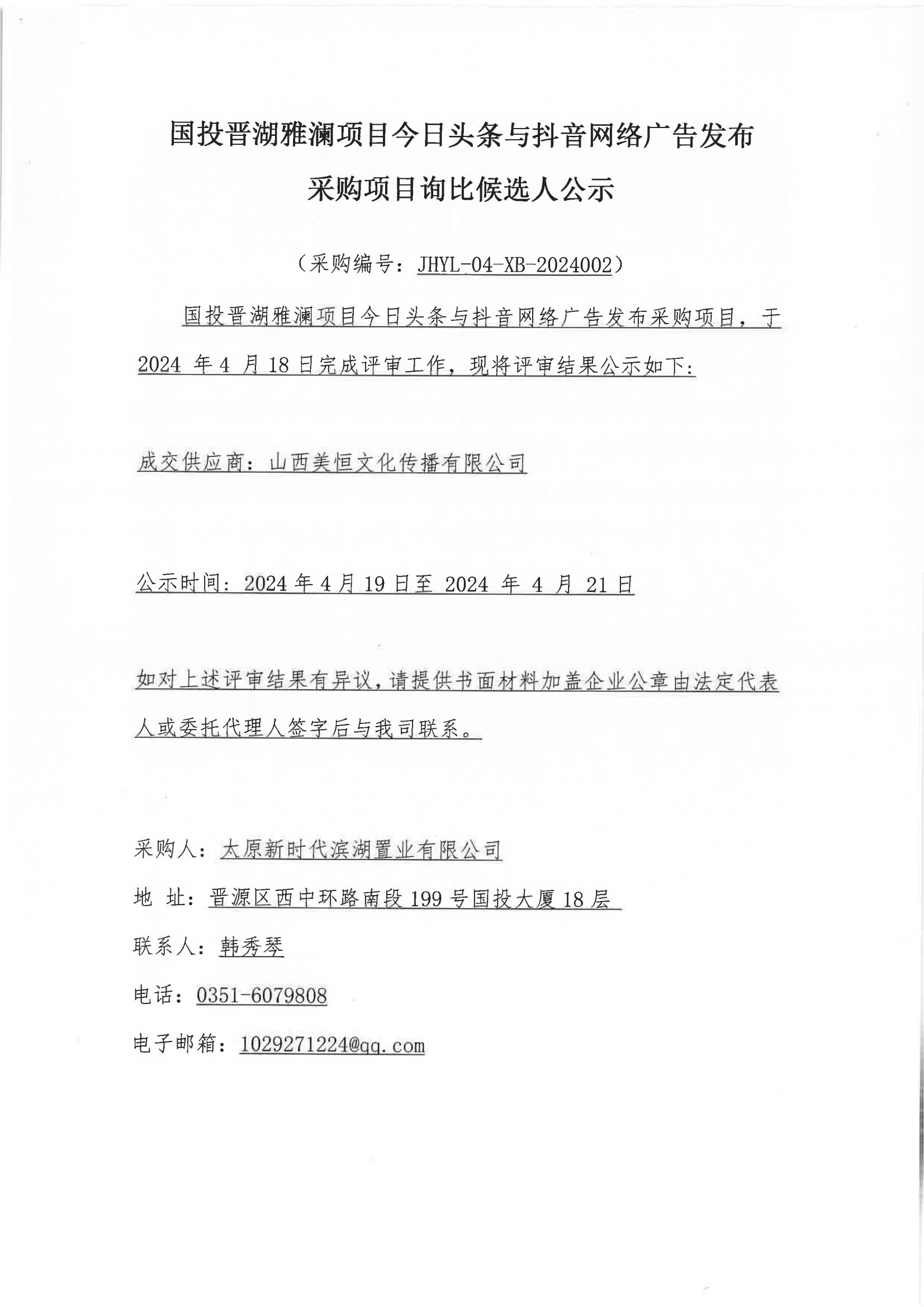 國投晉湖雅瀾項目今日頭條與抖音網(wǎng)絡廣告發(fā)布采購項目詢比候選人公示
