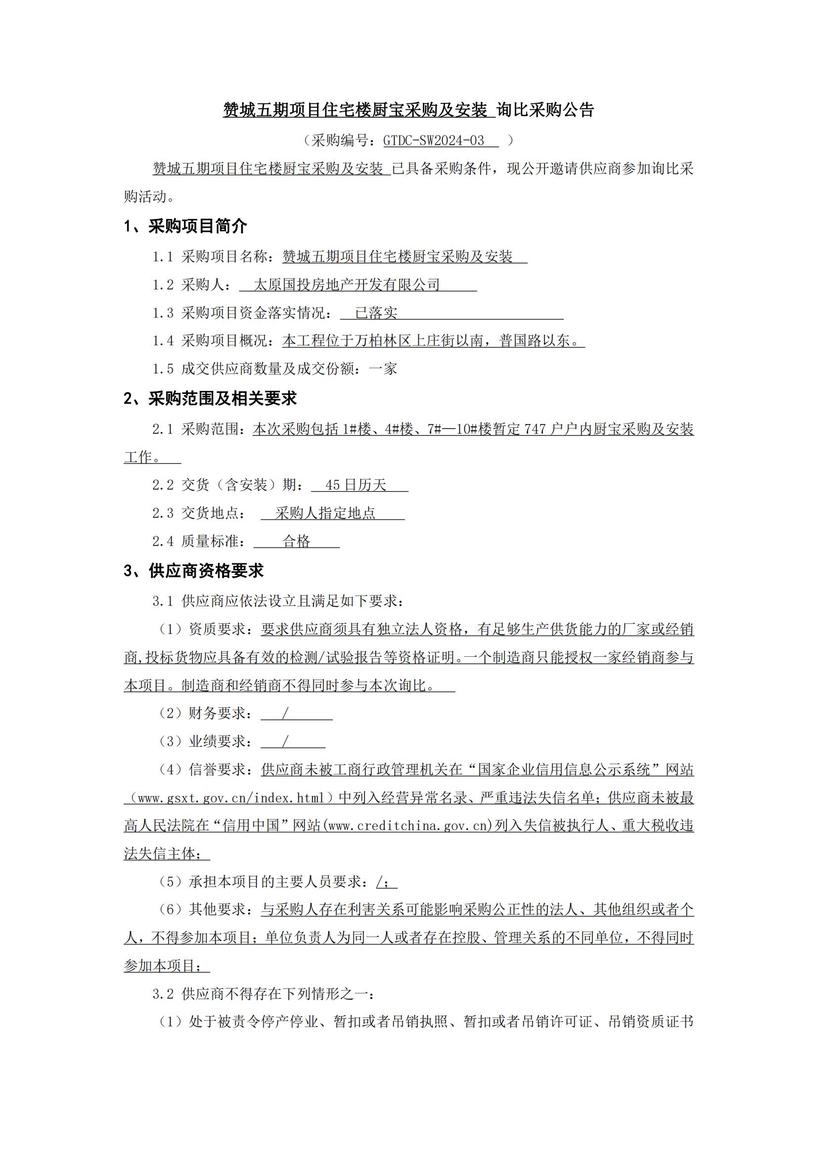 贊城五期項目住宅樓廚寶采購及安裝詢比采購公告