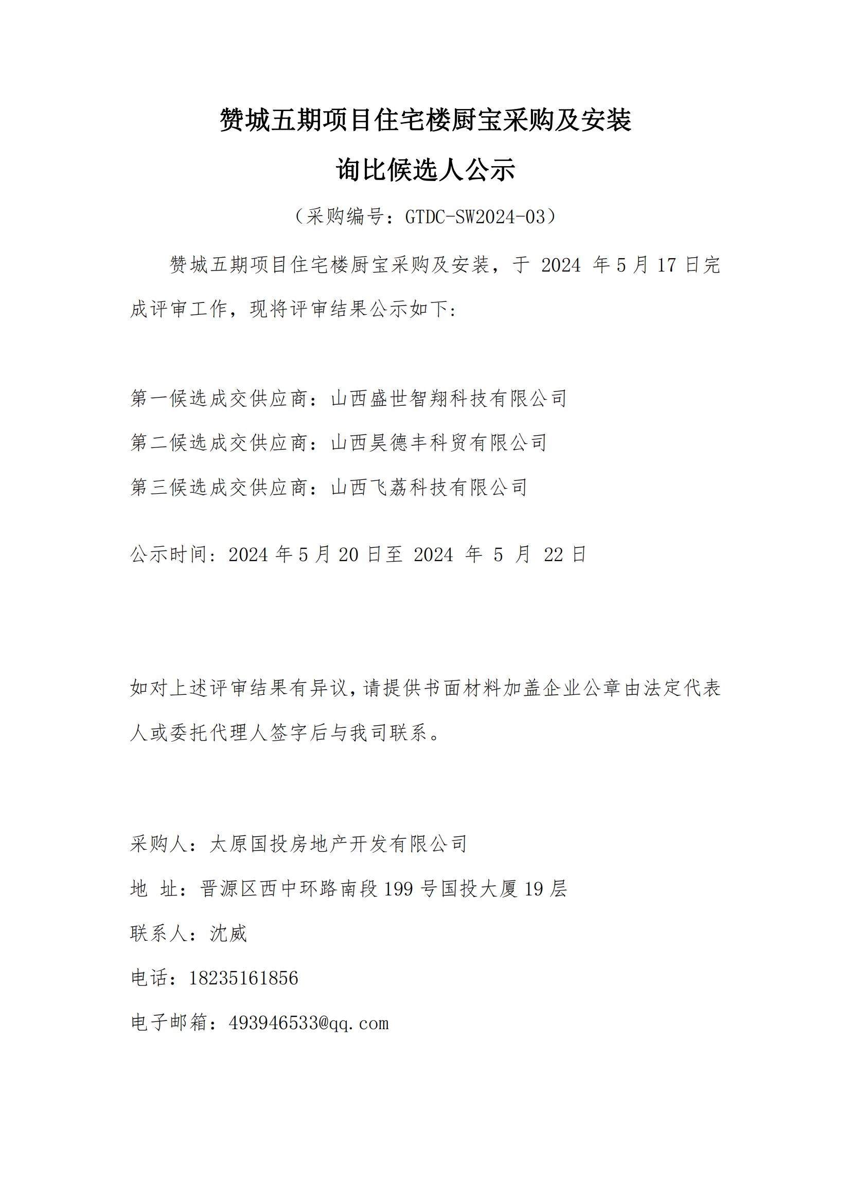 贊城五期項(xiàng)目住宅樓廚寶采購(gòu)及安裝詢比候選人公示