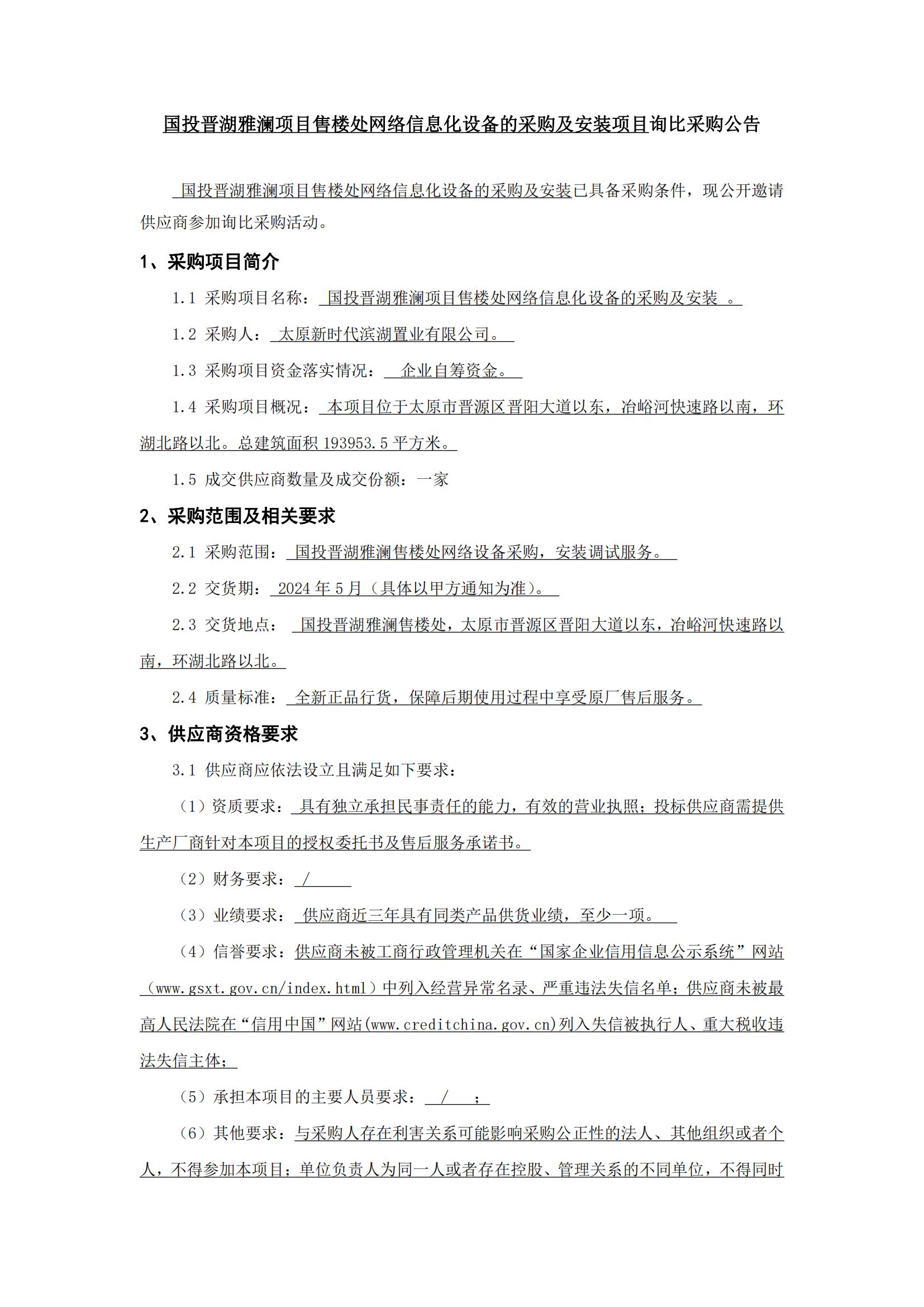 國投晉湖雅瀾項目售樓處網(wǎng)絡信息化設備的采購及安裝項目詢比采購公告