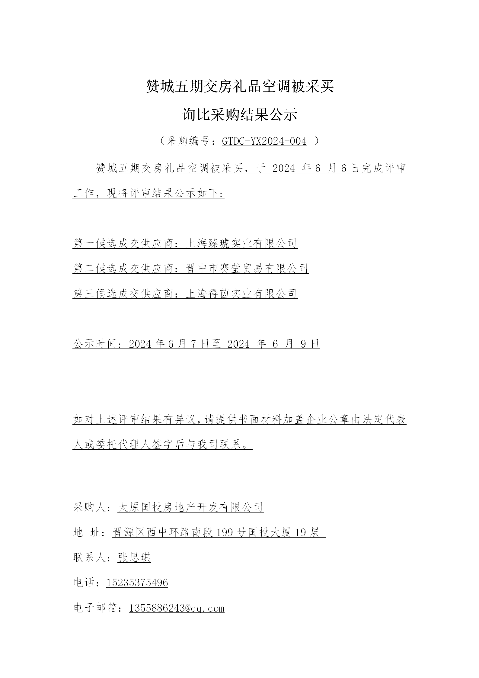 贊城五期交房禮品空調(diào)被采買詢比采購結(jié)果公示