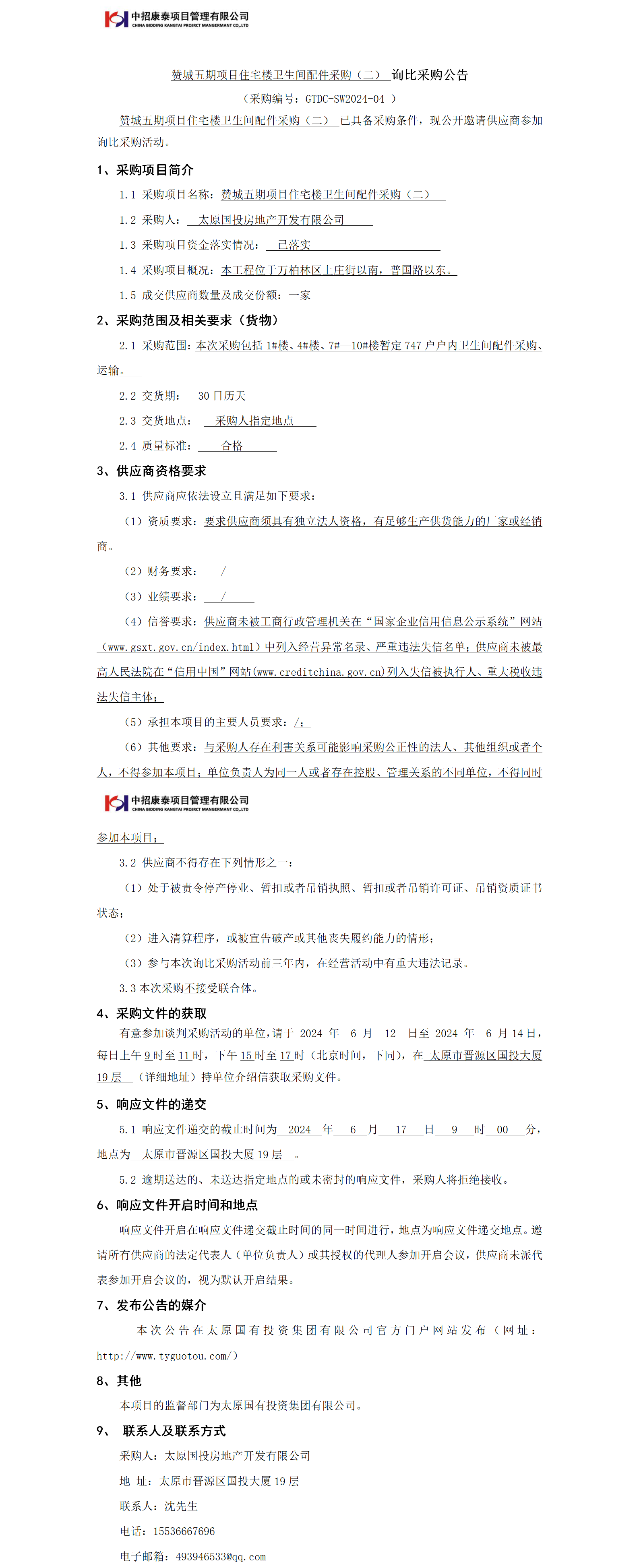 贊城五期項目衛(wèi)生間配件采購(二)詢比采購公告