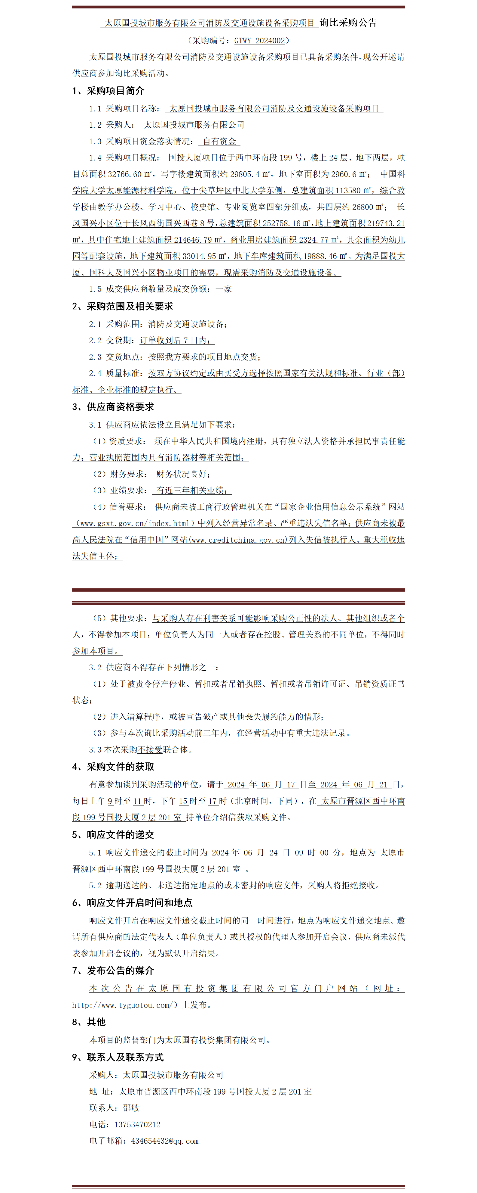 太原國(guó)投城市服務(wù)有限公司消防及交通設(shè)施設(shè)備詢比采購(gòu)公告