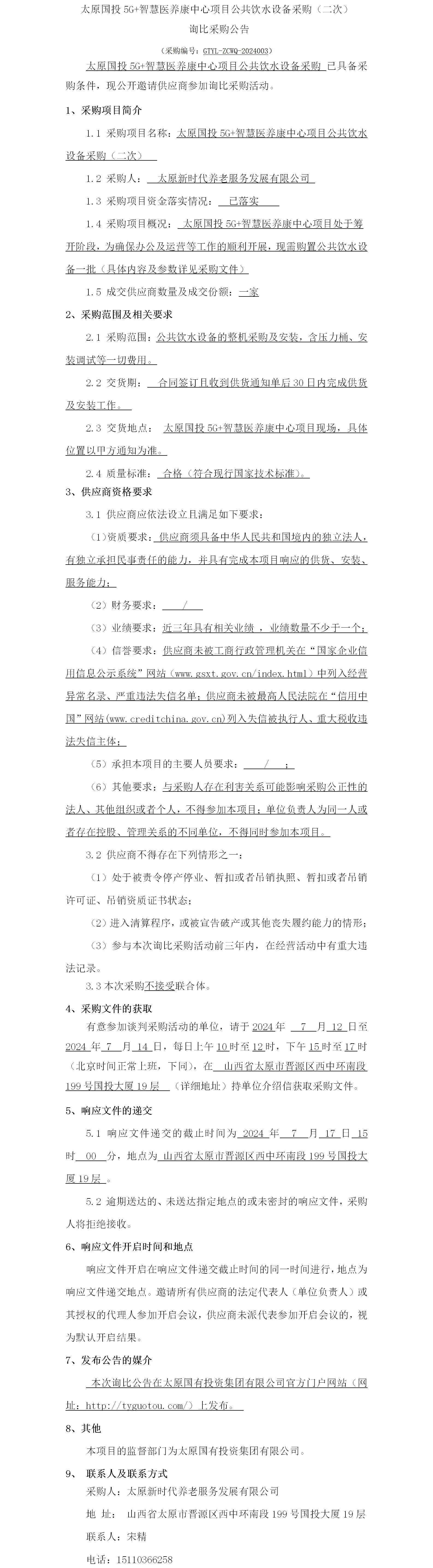 太原國投5G+智慧醫(yī)養(yǎng)康中心項目公共飲水設備采購(二次)詢比采購公告