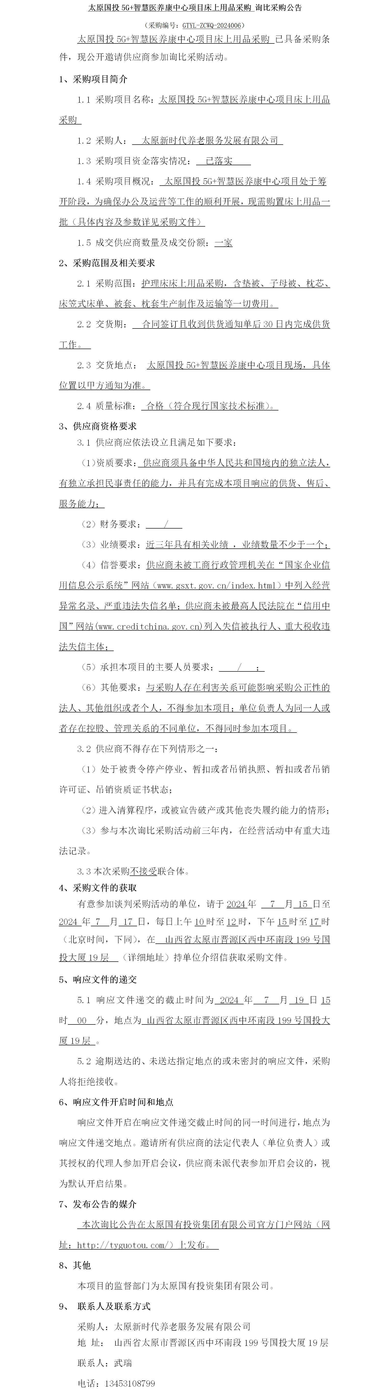 太原國(guó)投5G+智慧醫(yī)養(yǎng)康中心項(xiàng)目床上用品采購(gòu) 詢比采購(gòu)公告