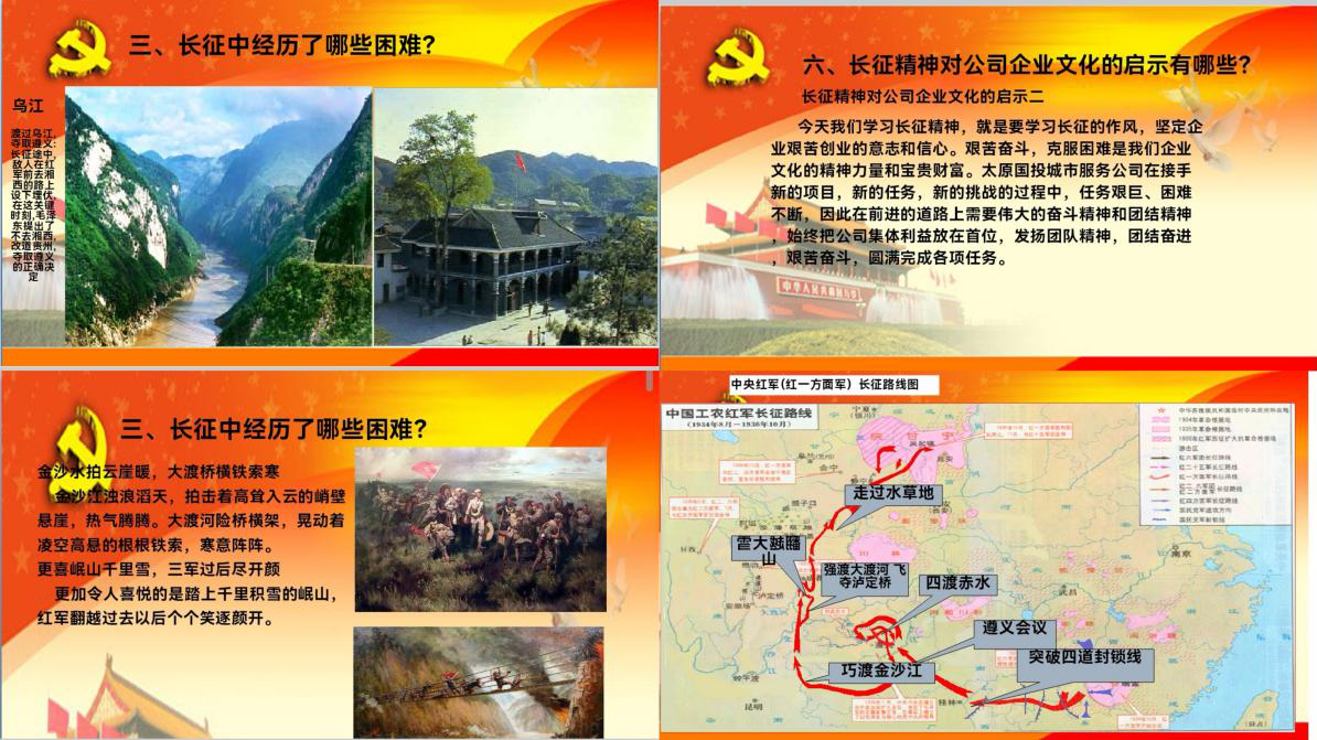 在熱烈的掌聲中,此次“弘揚(yáng)長(zhǎng)征精神”主題黨課活動(dòng)圓滿落幕。與會(huì)人員紛紛表示,通過(guò)這次活動(dòng),他們對(duì)長(zhǎng)征有了更深刻地理解,對(duì)長(zhǎng)征精神有了更直觀地感受。通過(guò)長(zhǎng)征精神的指引,太原國(guó)投城市服務(wù)將不斷超越自我,為實(shí)現(xiàn)奮斗目標(biāo)而堅(jiān)定信念,為客戶提供更優(yōu)質(zhì)的服務(wù)。