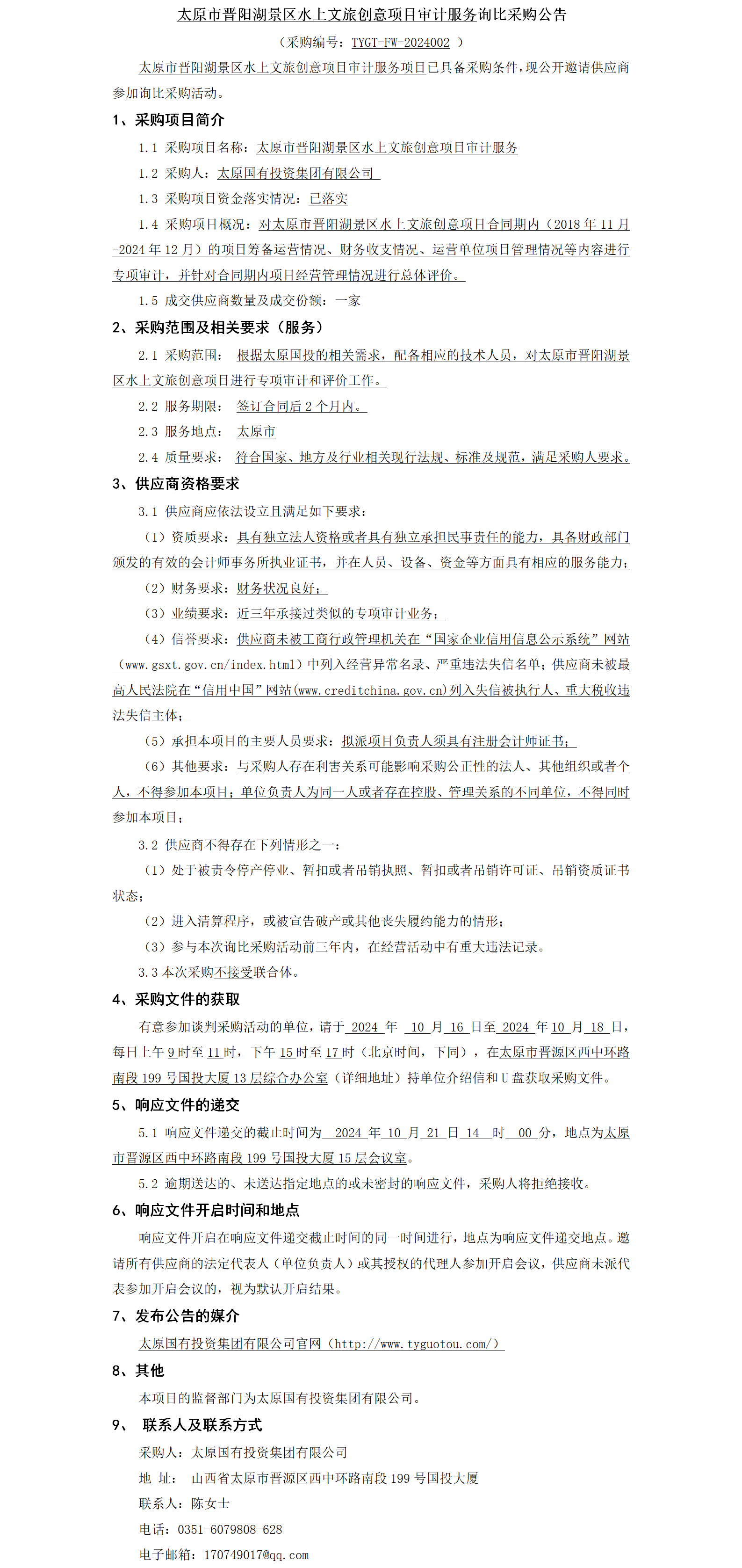 太原市晉陽湖景區(qū)水上文旅創(chuàng)意項目審計服務詢比采購公告