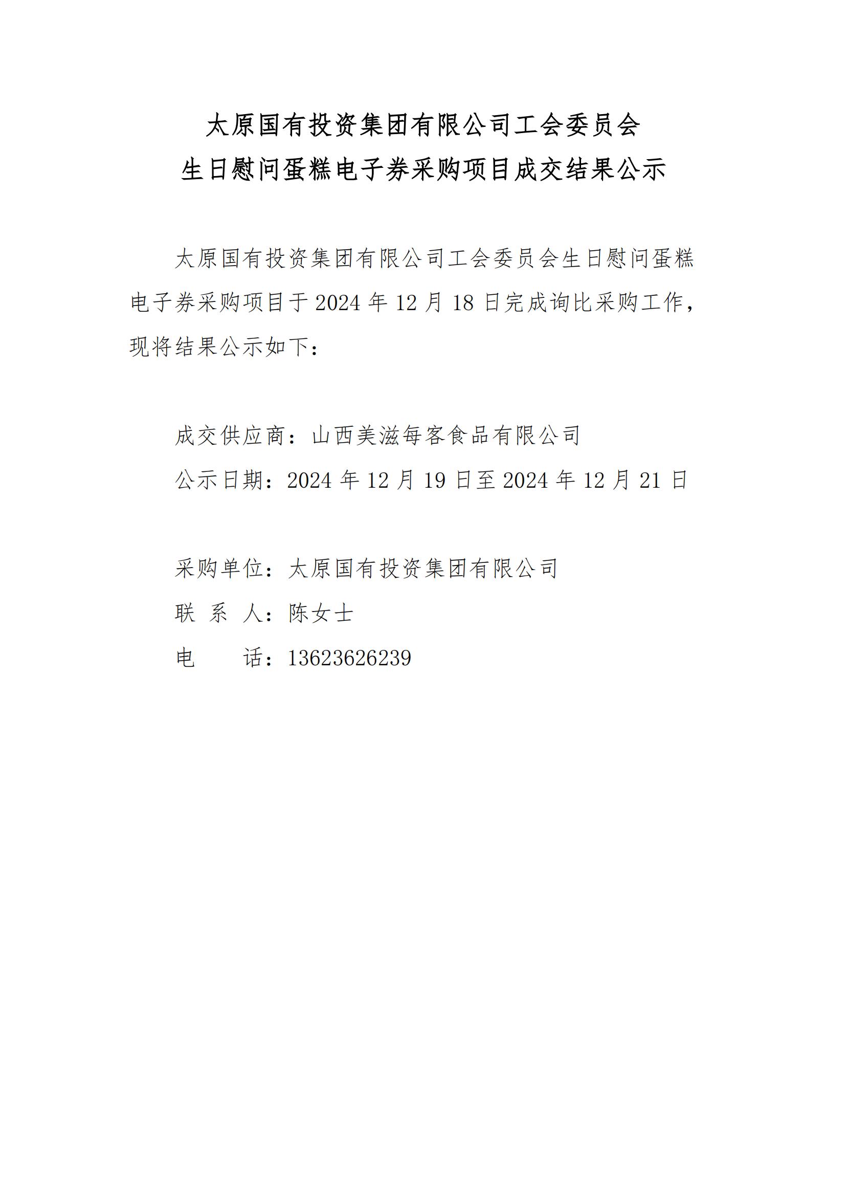太原國有投資集團(tuán)有限公司工會委員會生日慰問蛋糕電子券采購項(xiàng)目成交結(jié)果公示