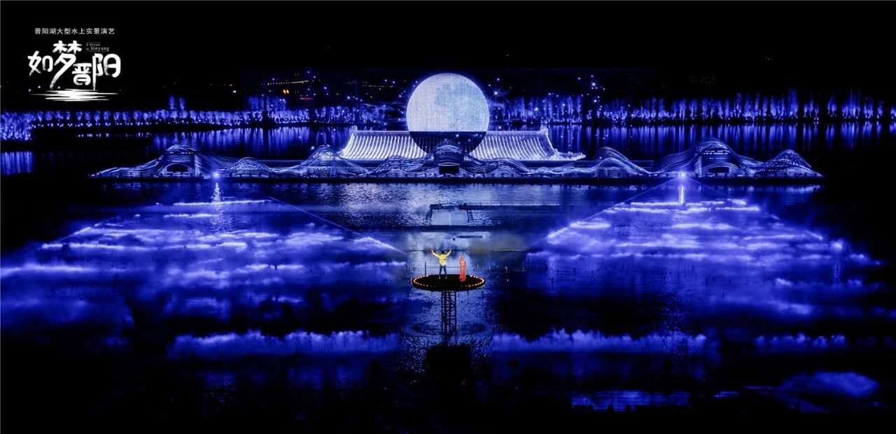 晉陽(yáng)湖大型水上實(shí)景演藝《如夢(mèng)晉陽(yáng)》是太原市重點(diǎn)文化旅游項(xiàng)目,是國(guó)內(nèi)首個(gè)以晉陽(yáng)文化為題材的文旅演藝項(xiàng)目。這是一場(chǎng)發(fā)生在晉陽(yáng)湖上的古今對(duì)話,通過(guò)現(xiàn)代年輕人和古代晉陽(yáng)人的相遇、碰撞,展現(xiàn)出華夏子孫,不怕?tīng)奚?、拯救大局、勇于?dān)當(dāng)?shù)木癖驹?。劇中通過(guò)皮影、晉祠等傳統(tǒng)晉文化元素和巨型噴泉矩陣、燈光、投影、激光、威亞等現(xiàn)代舞臺(tái)科技,形成弘大蓬勃的視聽(tīng)效果,將古晉陽(yáng)城的文化歷史精髓完美再現(xiàn),展現(xiàn)出昂揚(yáng)熱烈的晉人風(fēng)骨。